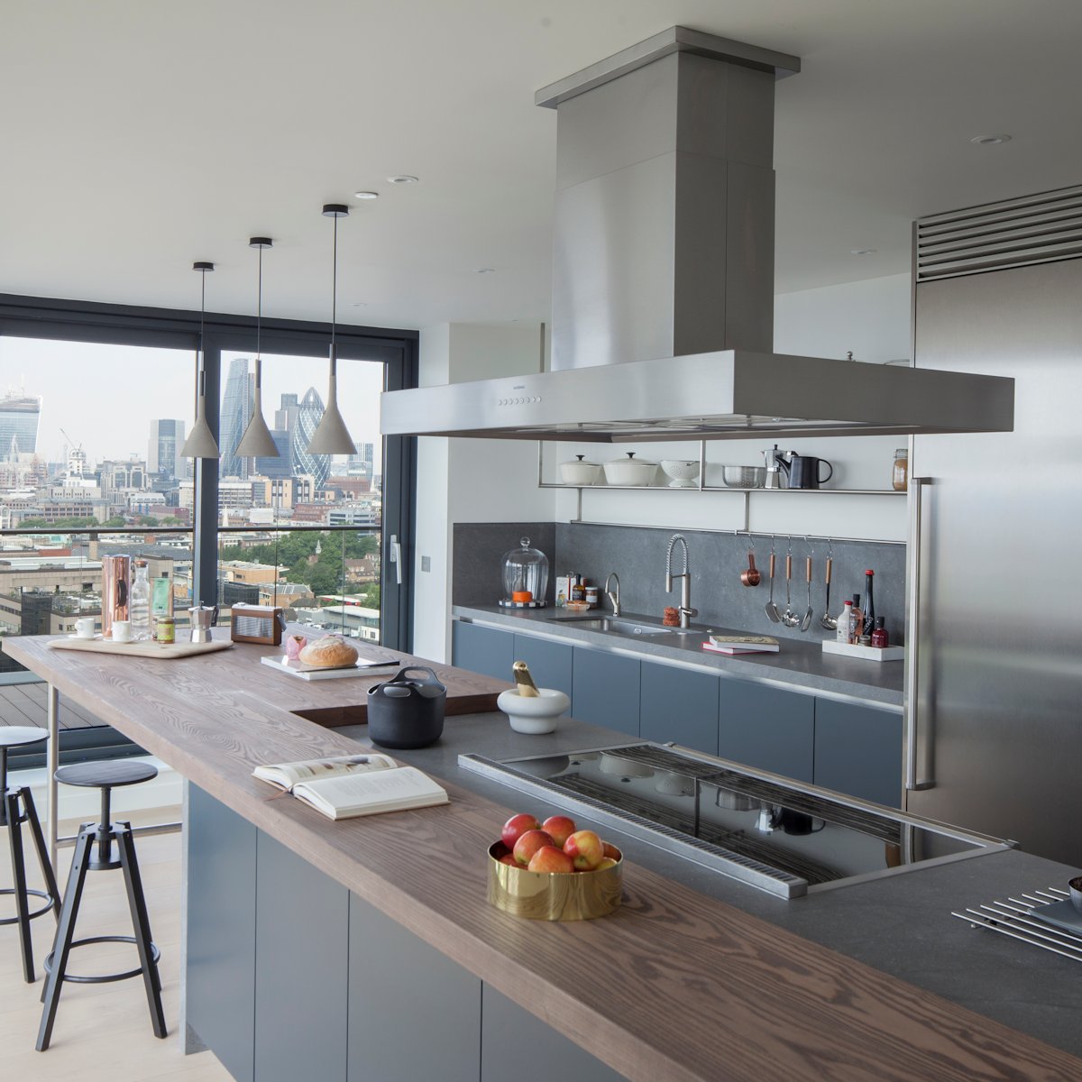 The living area is a large sweeping space: a true entertainment environment. The semi professional kitchen incorporates stainless steel, a chef’s tap, Gaggenau appliances and cooker hood, and a Falcon range cooker. Basaltina stone worktops sit over lacquered cabinets with oak veneered interiors, whilst the breakfast bar sets itself apart with a timber, butcher’s block style surface offering casual eating with views across the city.