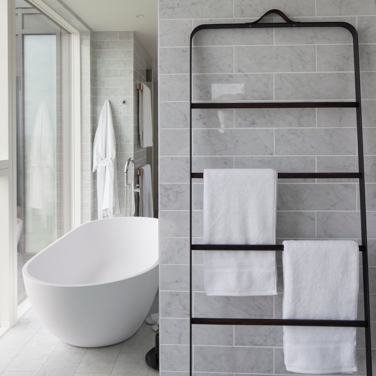 Firstly we wanted to celebrate a true master suite, on a par with what one would expect to find in the suite of a luxury boutique hotel. A completely open space was created, featuring a walk through wardrobe behind the master bed, and an open bathroom incorporating two countertop basins, minimalist disc operated taps, and a dramatic freestanding cast resin bath and tap with views stretching to Canary Wharf. A separate WC links to the bathroom, both of which are set against marble tiled floors and walls. The master bedroom has direct terrace access with far reaching views.