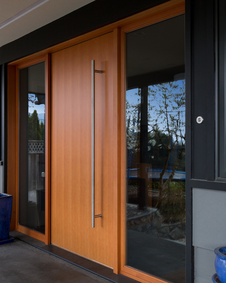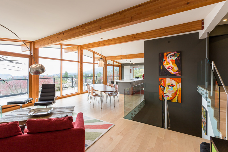 The exposed roof decking of the main ceiling was drywalled to brighten the space while painted glulam beams were sanded and stained to bring back their natural vitality. A diminutive entry stair was widened and made a central feature in the design.