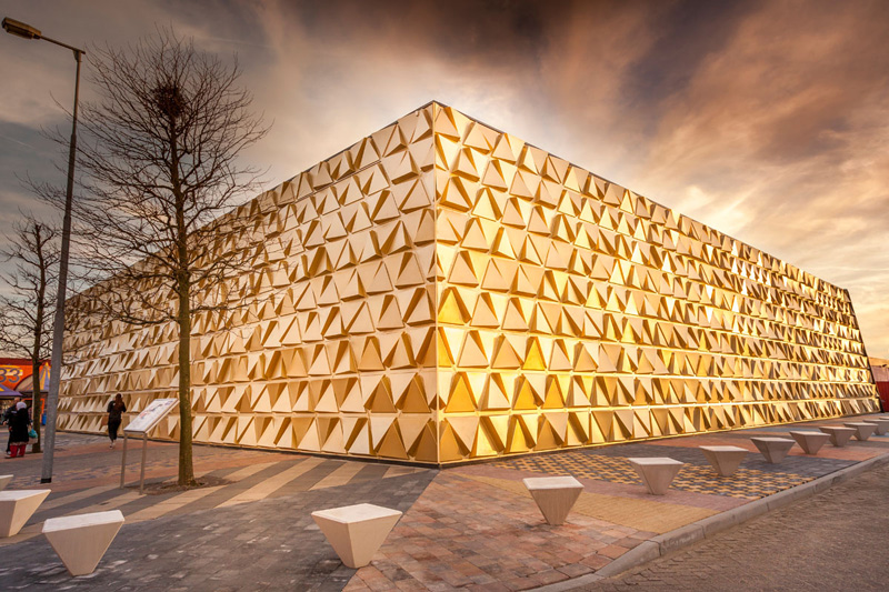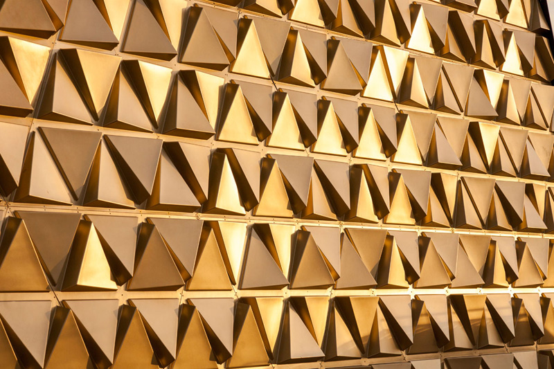 EXECUTION – The golden facade of the Goud souk consists of relief panels with a triangular pattern. By repeating these panels throughout the whole facade with a varied orientation, a very diverse facade emerges, a real eye catcher. Thanks to the lighting between the panels, the golden facade shimmers day and night.