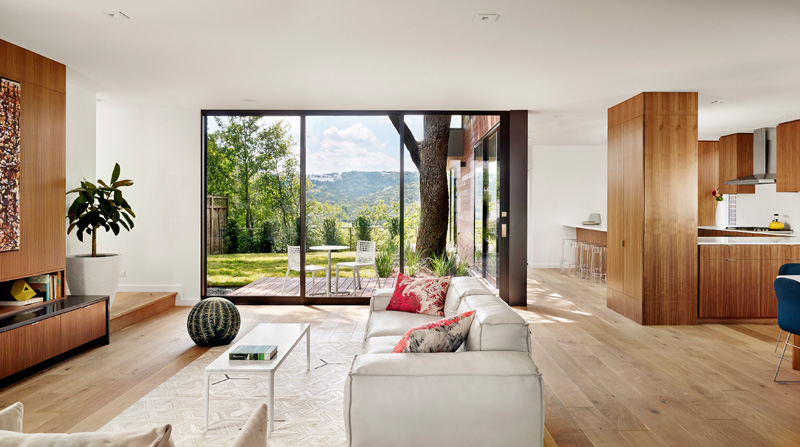 A New Family Home Sits Comfortably In The Hills Of Austin, Texas by Erin Miller on August 3, 2015 Matt Garcia has sent us photos of a new contemporary home in Austin, Texas, with the interiors designed by Kopicki Design. Photography by Casey Dunn