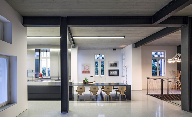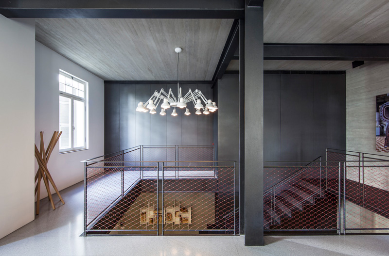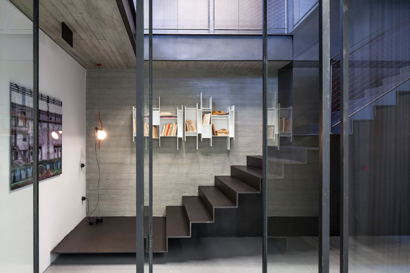 In order to preserve and respect the tradition and the past, the materials chosen for the apartment’s renovation were all raw materials (exposed concrete in walls and ceilings, steel for the beams and pillars, iron for the facades of the closets and stainless steel net for hand rails).