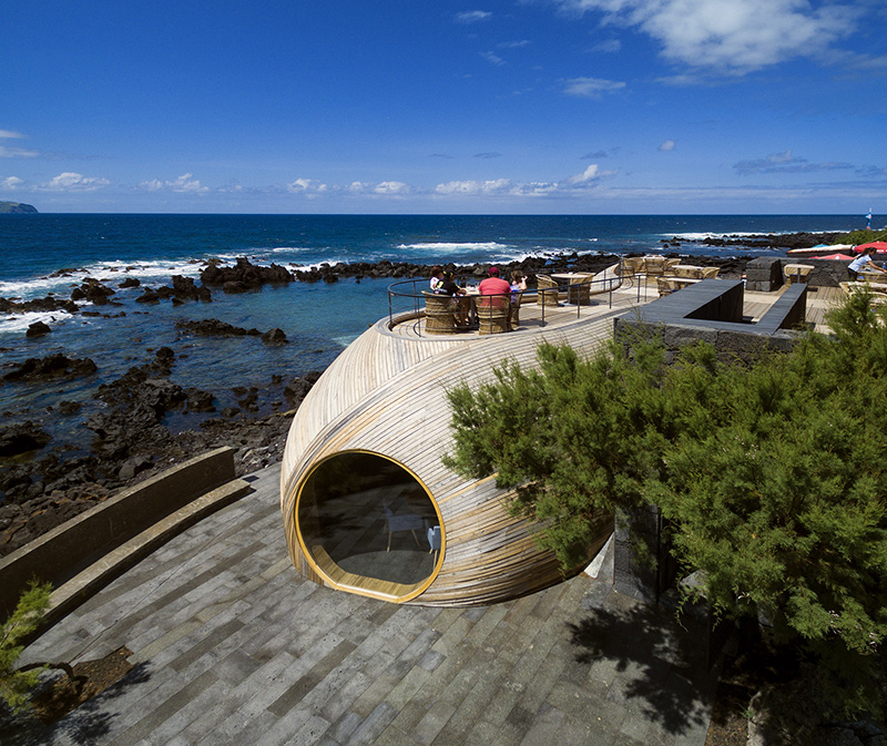 Several features of that environment are present in the architecture of the building, including the outline of the island, rocks, whales and wine casks.