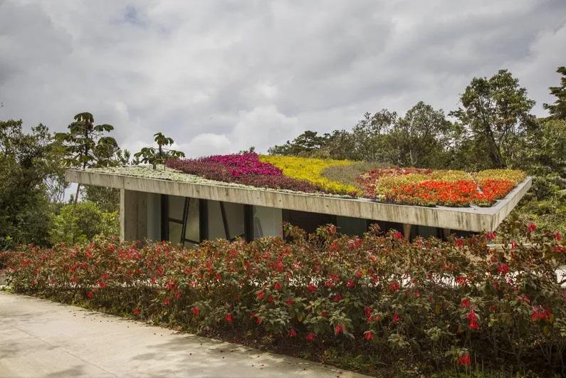 This visitor center for a public park in Colombia, designed by Juan Felipe Uribe de Bedout, has a sloping roof, so it can show off the colorful garden it has planted on it.