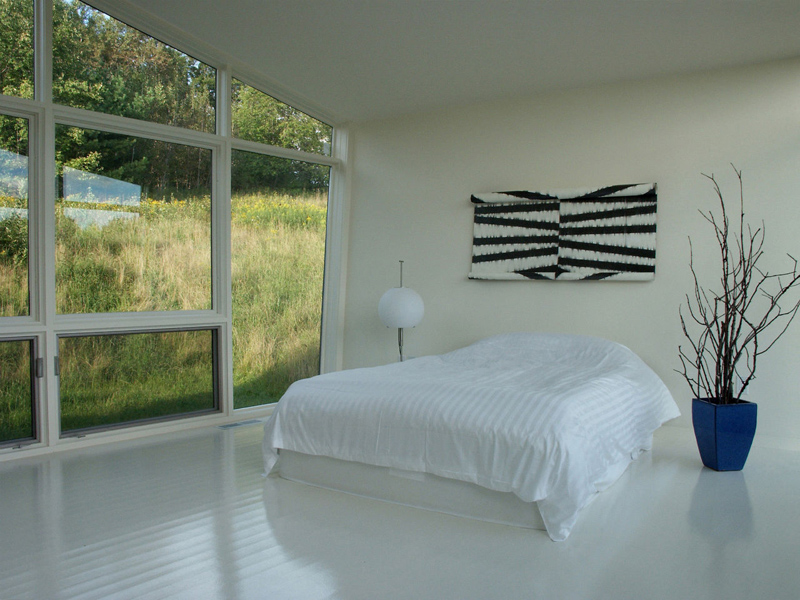 The secondary space serves as a master bedroom suite with floor to ceiling glass on both sides again blurring the distinction between interior and exterior. A concrete plinth elevates the house slightly above landscape increasing the sense of lightness often found in Oriental design. The house is designed to be relatively inexpensive both in construction and maintenance, and to have the compactness and interior sparseness akin to traditional Japanese architecture so as to serve as a peaceful retreat from busy city life. As much of the site as possible has been left untouched and restored for the growth of natural wild flowers, which dominate the surrounding landscape in the summer.