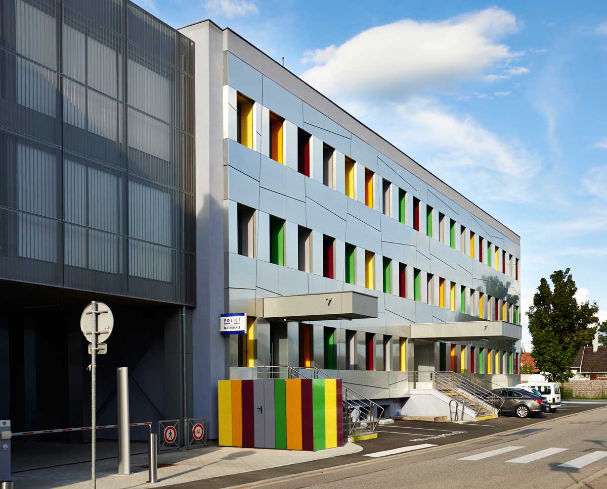 In our project, there are no “secondary” façades, as they are all visible from public space. The façades of the Centre Social et Administratif (administrative and social centre) were originally built using prefabricated concrete slabs containing little thermal insulation. Their appearance clearly indicated the building’s 1970s origins. This called for an intervention that was both functional and aesthetically pleasing. Consequently, metal-look aluminium composite cladding with high-performance thermal insulation was installed on the facades of the building. The irregular layout and clearly marked joints combine with the colourful window recesses to create a uniquely customised facade. Each window has an adjustable brise-soleil sunshade that can be used to deflect sunlight, especially in summer. On the east side of the building, a new metallic stairway has been created. It is sheltered by a white moulded concrete wall, which has been erected to reduce noise from the future tramline.Accessibility for all
