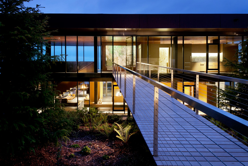 Perched above the beach at the edge of the tree line, this vacation home allows the dramatic Oregon Coast to take center stage. The design maintains sightlines from the sheltered forest to the open coastline with a minimal structure of glass and steel. Atop the two-story, transparent box, the copper-clad green roof is an elevated slab of native ferns and grasses.