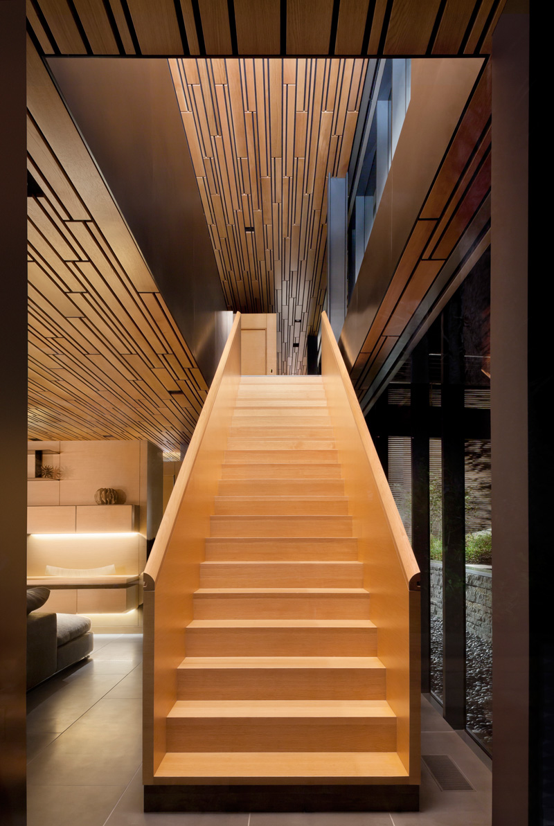 Only the upper floor is visible from the forested driveway. Accessible via a catwalk and oversized glass pivot door, the upper level contains the main living spaces – living room, kitchen, dining room – and offers views in every direction. Cabinetry is pulled to the center of the space to free the exterior walls from obstruction. A small gap between the basalt flooring and the curtain wall creates an “infinity” effect along the perimeter.