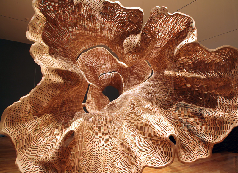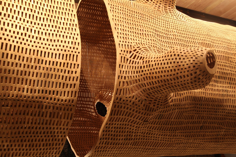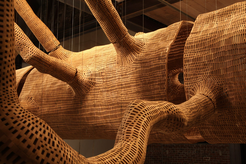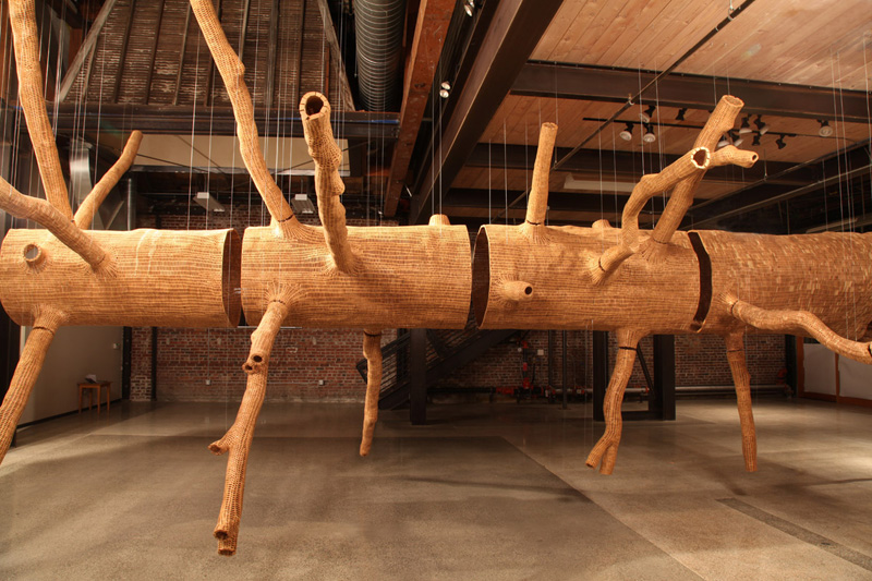 Middle Fork, is made up of hundreds of thousands of individual wood pieces, creating an intricate and expansive form. The elaborate process of creating this sculpture began in a forest in North Bend, WA, where John and his team of assistants scaled a 140-year old Western Hemlock tree to take plaster casts of its trunk and limbs. Over the following 10 months at MadArt Space, the casts were used as guides in creating the complex structure of the sculpture.