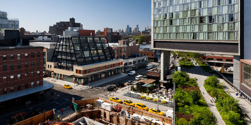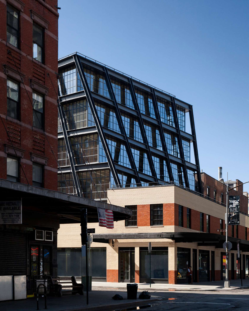 Situated across the street from the High Line in Manhattan’s Meatpacking District, this new commercial office building sits atop an original two-story Art Modern-style industrial depot that has been restored, preserved, and given the cantilevered metal canopy that is signature to the neighborhood.