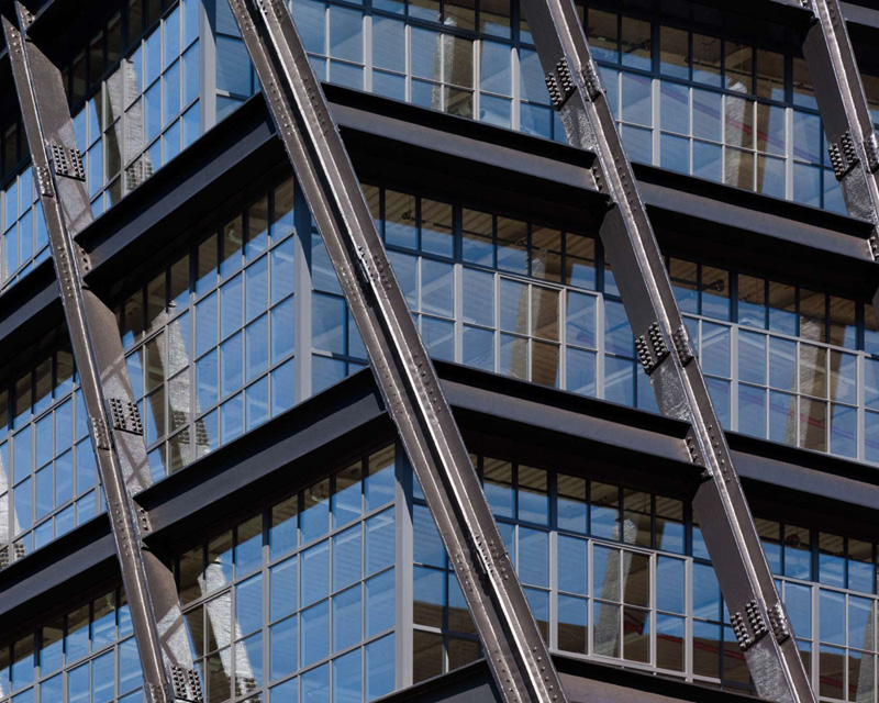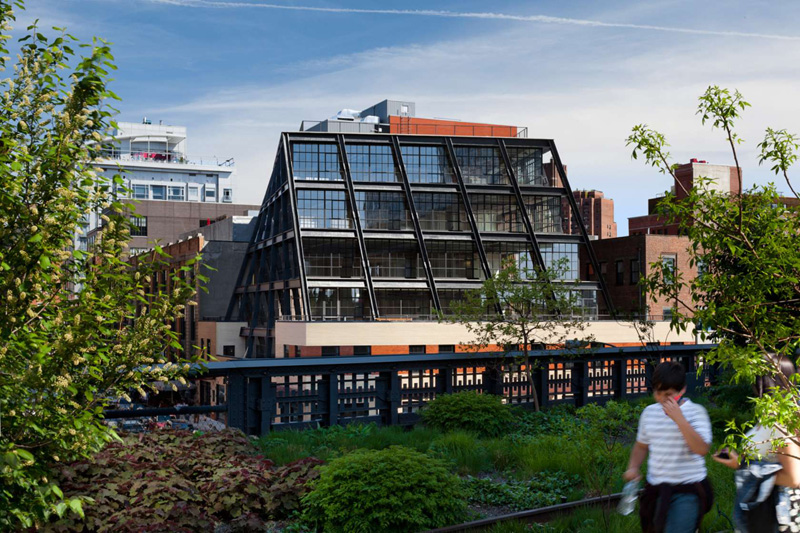 The new tower is a twisted, steel exoskeleton with a curtain wall of tall, mullioned windows. The design echoes the post-industrial garden of the High Line, incorporating planted beds that nest within the voids created by the torqued edges of each floor slab.