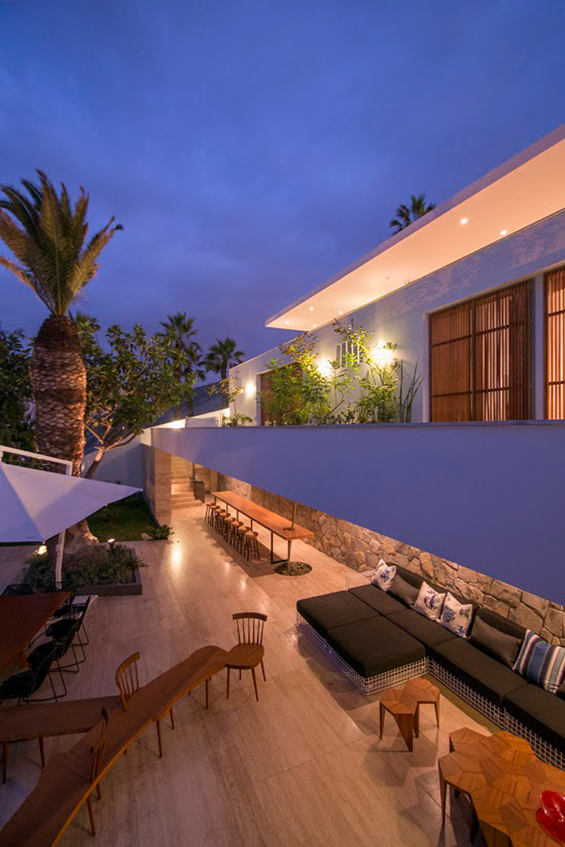 The design follows the guideline set by the original project, using low wall hangings on the terraces and prolonged horizontal surfaces, but reimagining and adapting them to the profile in the perimeters of the plot, as well to the palm and other trees line of the surroundings. The composition language is reinforced through the use of natural stone from the same area instead of regular wall coverings.