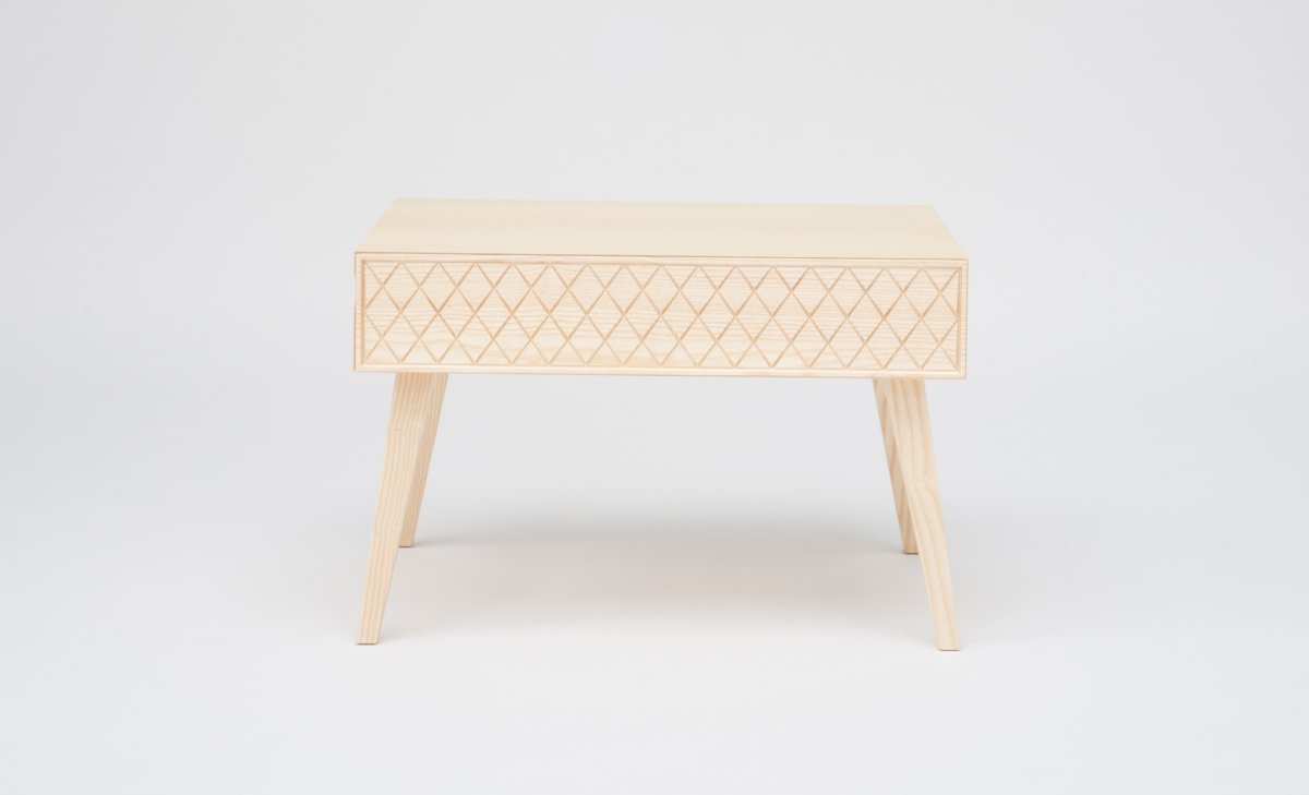 The frame of the armchair makes a feature of the ash wood’s beautiful grain and boasts refined joinery details. The square tufting of the tweed upholstery is repeated in the three-dimensional pattern carved into the sides of the coffee table, which hides a handy storage space.