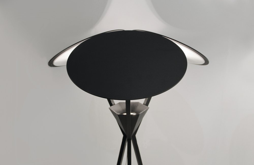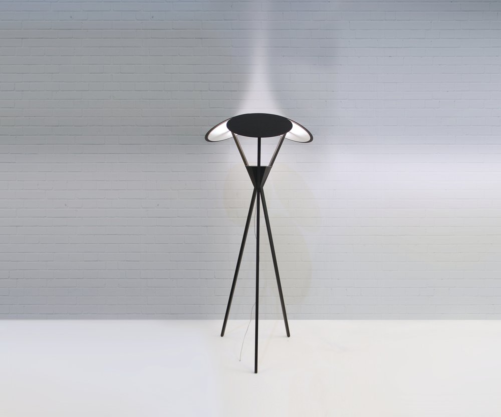 Three discs top the lamp, Leds projectors pointing towards them. PMMA (a highly shatter-resistant and lightweight thermoplastic) craflty diffuse a subtle, indirect light. The lamp, cutting a very graphic silhouette, was thought to guide the light towards the ceiling and the ground at the same time.