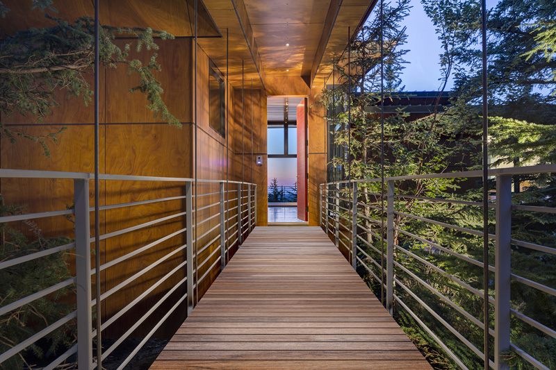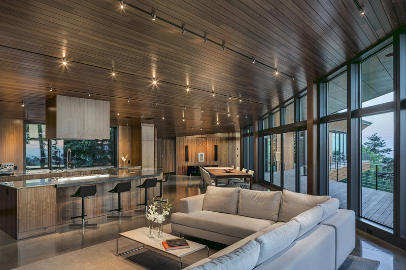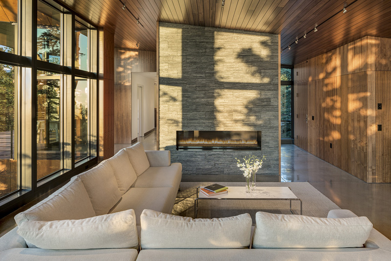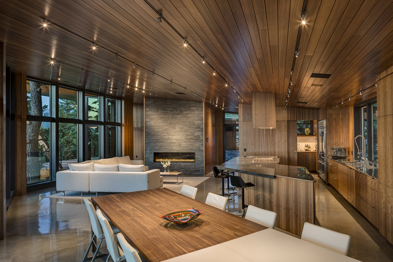 Perched above the landscape, the platform stretches across the hillside like an extended tree house. Interior and exterior surfaces are clad with walnut panels, natural stone, and concrete floors to create a distinct and varied experience of the Alaskan landscape.