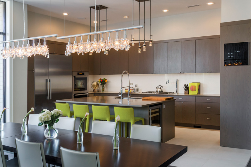 The overall look is sleek and contemporary, but the addition of brilliant color warms the space. The resulting home is perfect for two people, perhaps to ready a book fireside, or for entertaining a group throughout the open space.