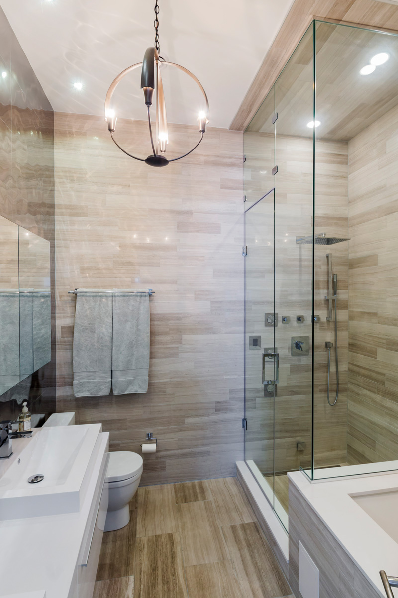 Nancy met with the builder to choose finishes, and worked with the clients to decide which of their existing furniture would work in the contemporary look they desired. Nancy’s design focused primarily on a gray palate throughout the apartment, giving it a sleek look, but also added depth with the use of various textures and scales.