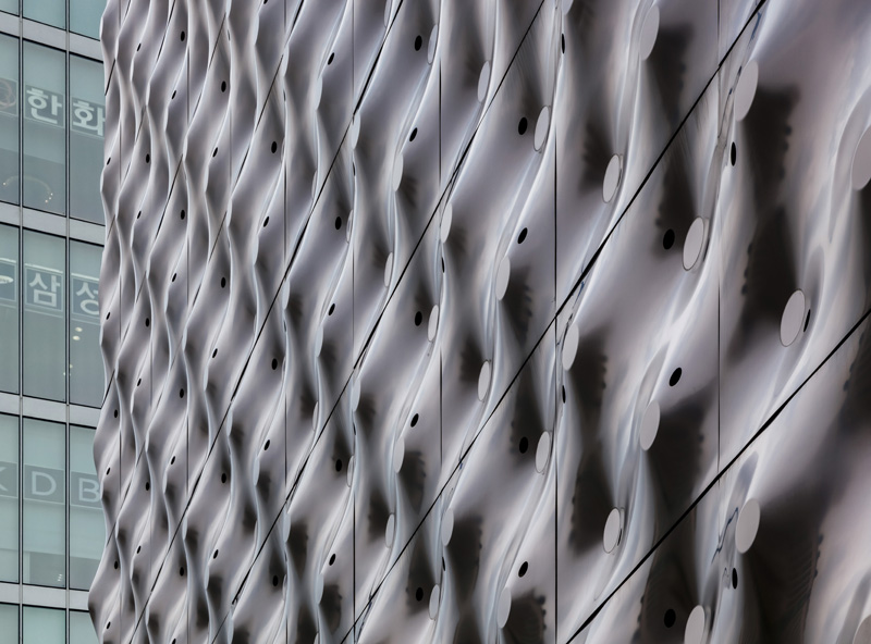Inside the cut, at the upper corner of the building, it appears a surface of satin brass which becomes an urban element for those who follow the great way of Cheongdam. At the same time it evokes the brand since it is a direct reference to the famous T cut style of Givenchy. The corrugated iron has irregular holes that in the evening light interact to continuously modify the image of the building, generating kinetic effects that makes the whole building a dynamic structure and street landmark.