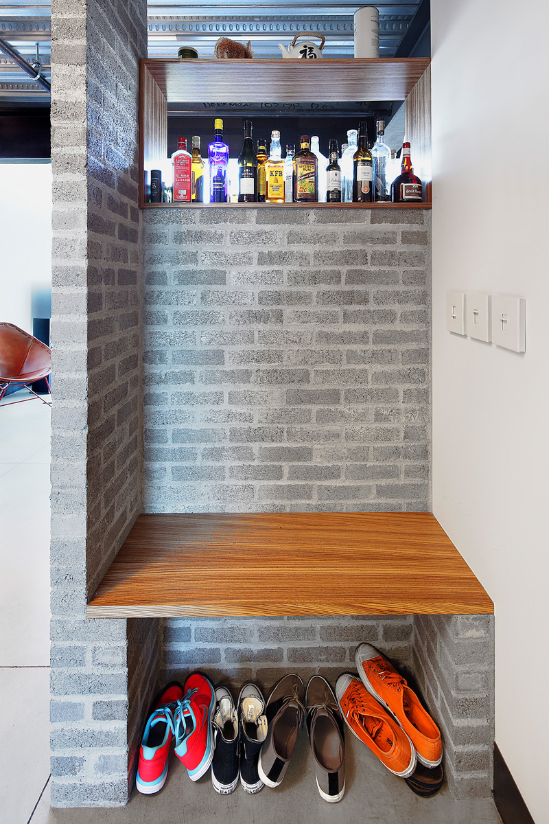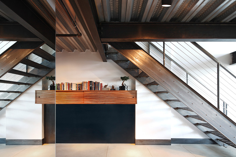 The main challenge was to add functional elements to the space that blended with the building’s original palette of concrete floors, zinc plated pan-decking ceiling, and blackened steel beams and railings. Inserting a mix of texture, raw materials and functional elements, SHED Architecture & Design was able to artfully marry the new additions with the original industrial construction using a palette of concrete brick, stainless steel plate, blackened steel and mirror.