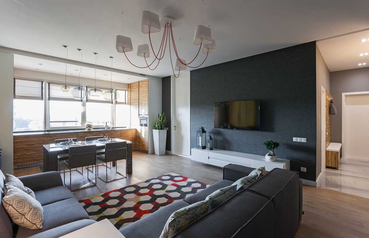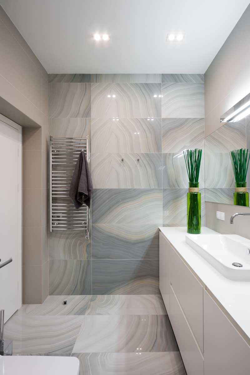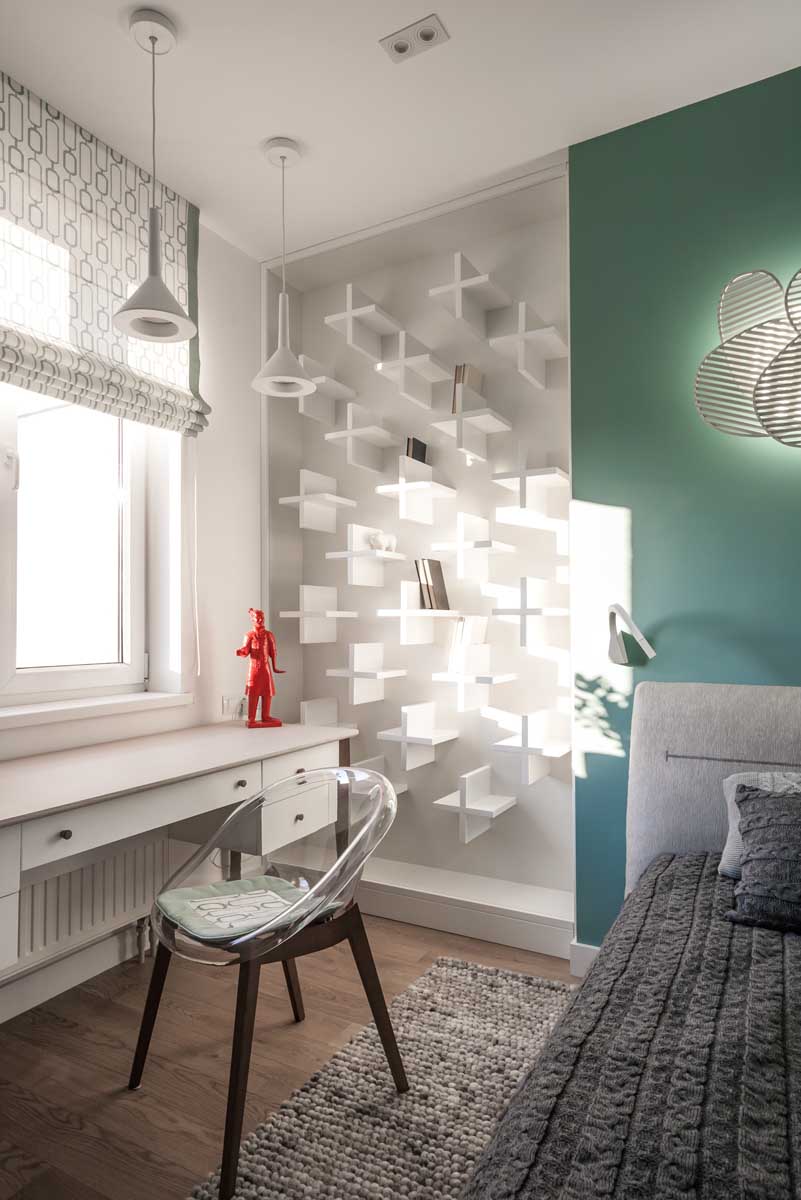 Natural materials and the combination of textures of wood, marble and surfaces of grey walls in the living room and compound blue color in the bedroom were used in the interior finishing. The felt wall creates special comfort and warmth in the living room. The bright and rich coloring decor, lighting and the carpet brighten up the general moderation of space. But perhaps the most remarkable and valuable accent of the interior can be considered the painting by Anton Sokolov which creats warm atmosphere in the dining room. The bedroom looks fresh and crystal clear and the composition of the rack behind the bed gives peculiarity to the interior and reflect ideologically the positive attitude coming from the family of customers. Lighting plays an essential role in the interior. Design models of lamps transform the interior not only with the help of light but also with the help of color.