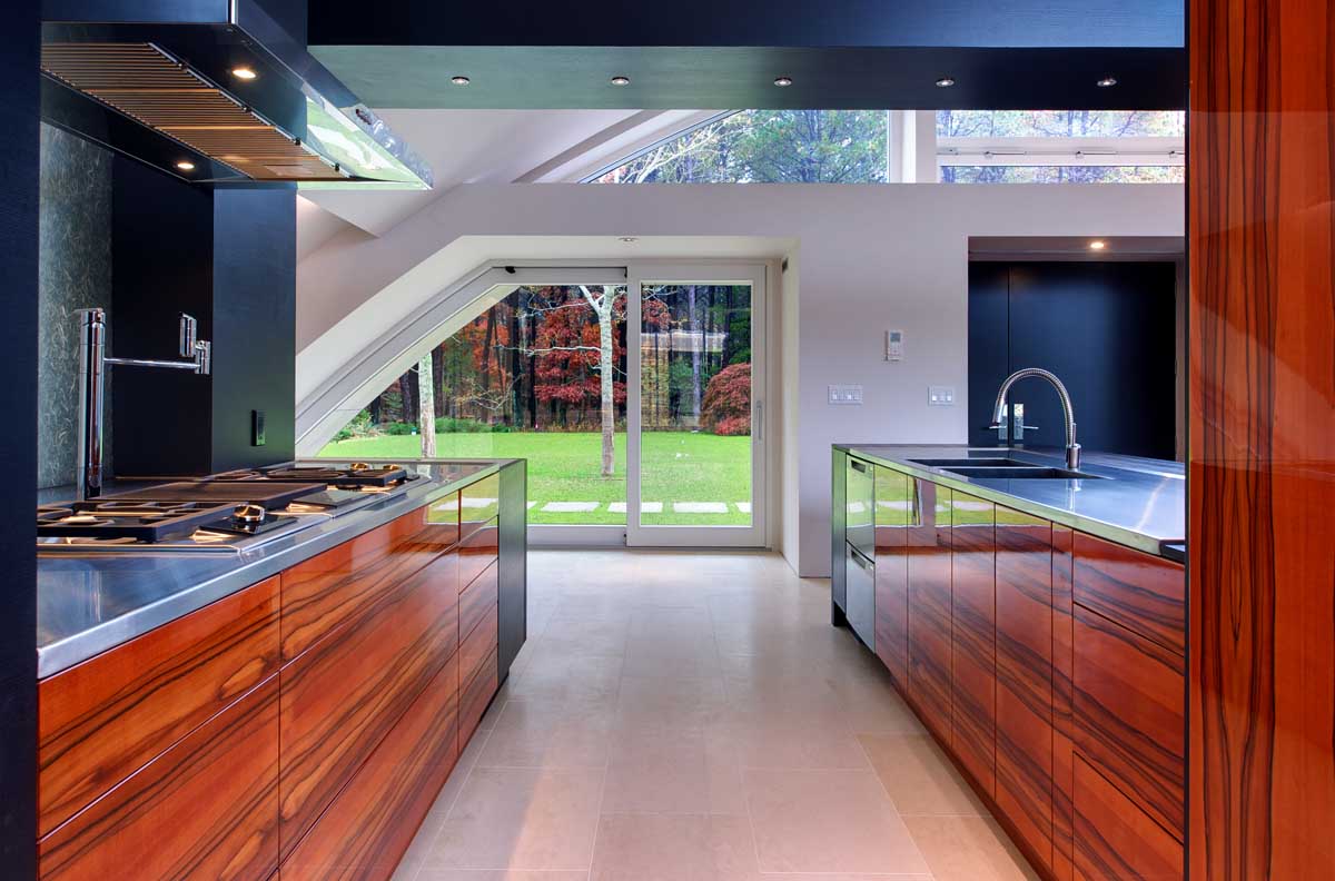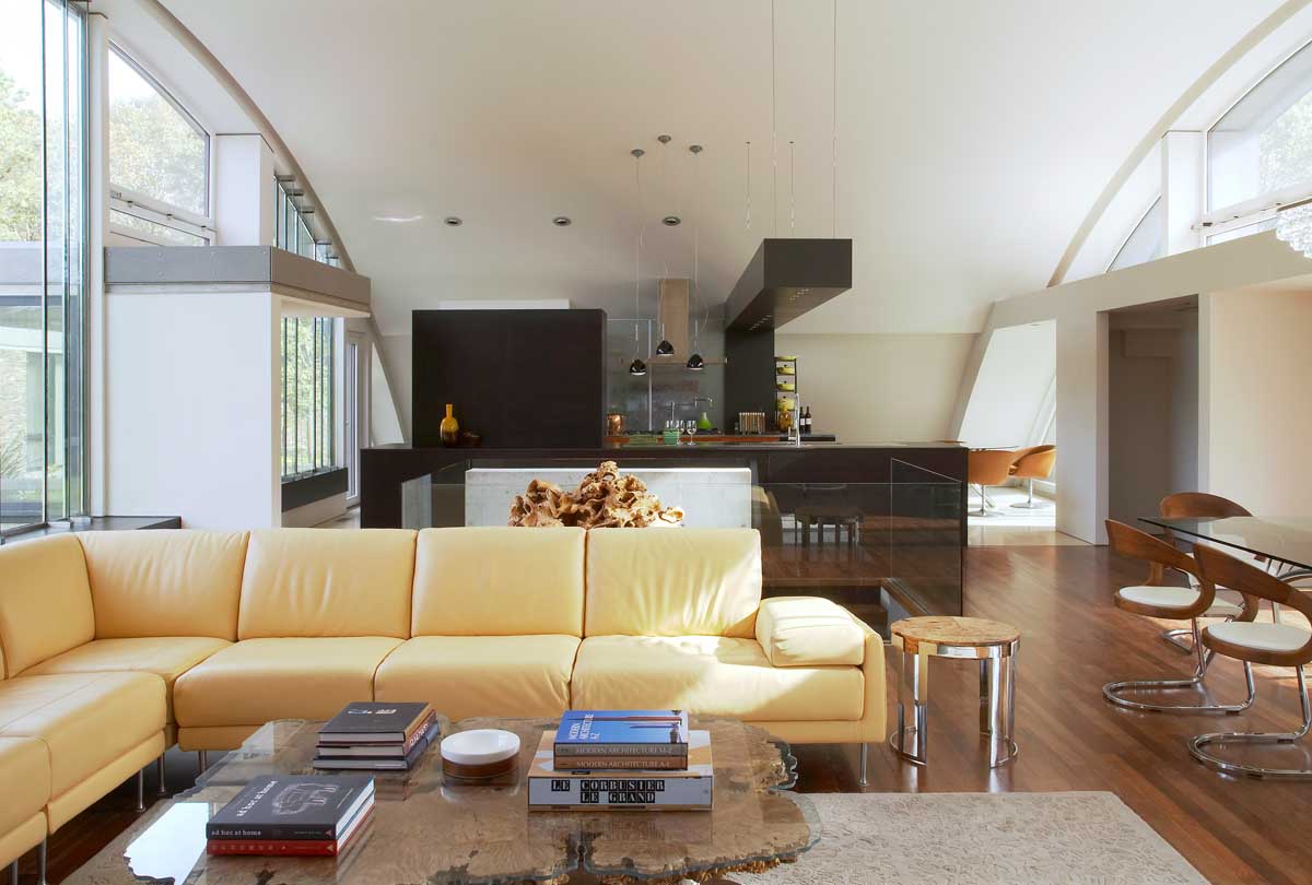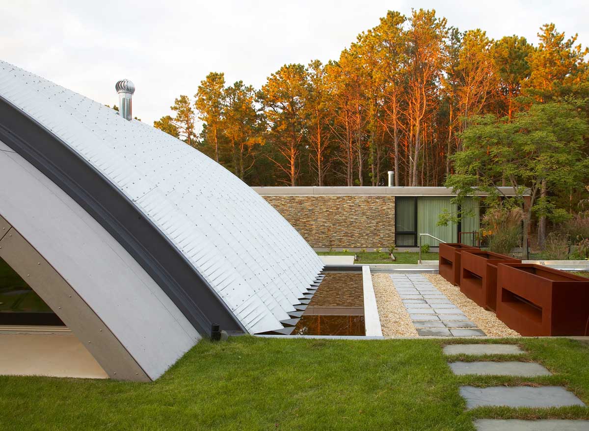 The arch contains the living, dining and kitchen areas in an open plan. A staircase, the kitchen counter and other low-height components define the space within it. The entry canopy to the arch and a few other components within it are at a height of 7’, creating a touchable lower plane within the larger structure. To allow the client to be able to increase the number of bedrooms, we decided to house them in a flat roofed section, in the rear, made of structural insulated panels; the bedrooms are accessed through a connecting bridge. The lay out is simple and efficient and can easily accommodate horizontal additions. Geothermal and high-efficiency HVAC, glazing u-values down to .12, SIP paneling, and a green roof contribute to the lowering of energy costs.