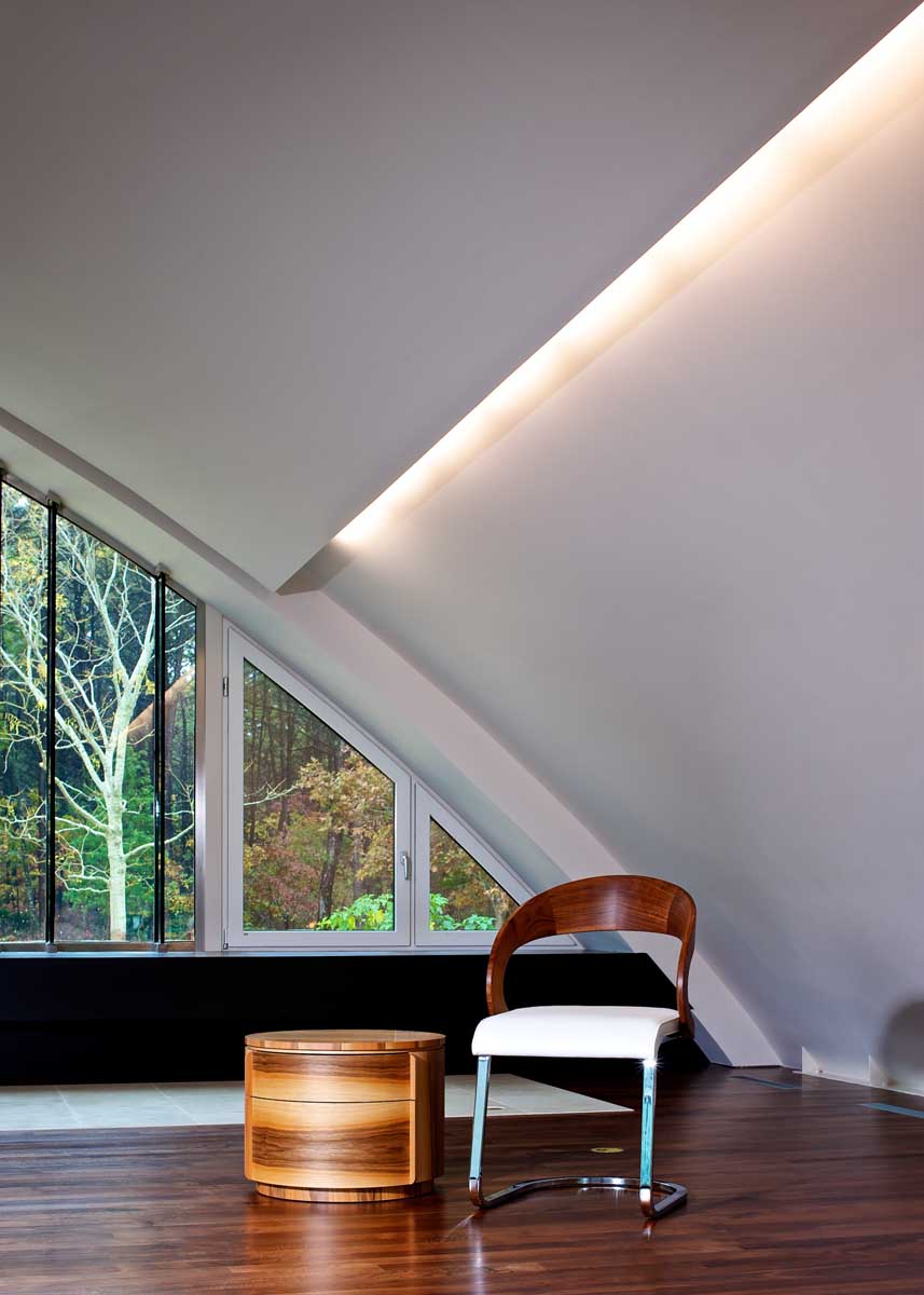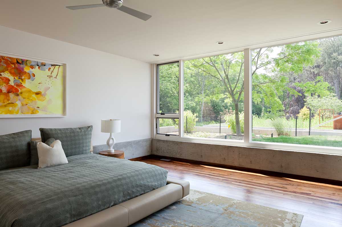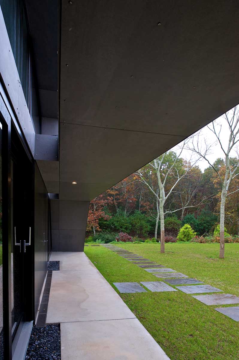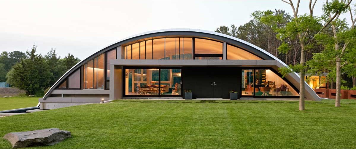 The arch contains the living, dining and kitchen areas in an open plan. A staircase, the kitchen counter and other low-height components define the space within it. The entry canopy to the arch and a few other components within it are at a height of 7’, creating a touchable lower plane within the larger structure. To allow the client to be able to increase the number of bedrooms, we decided to house them in a flat roofed section, in the rear, made of structural insulated panels; the bedrooms are accessed through a connecting bridge. The lay out is simple and efficient and can easily accommodate horizontal additions. Geothermal and high-efficiency HVAC, glazing u-values down to .12, SIP paneling, and a green roof contribute to the lowering of energy costs.