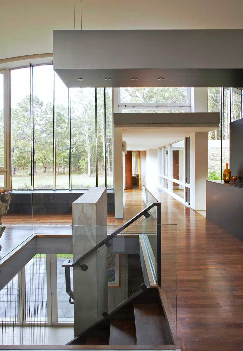 The site itself is nearly three acres and is surrounded by a tall canopy of pine trees. This gave us a natural spatial boundary that would allow the living spaces to be open and require less privacy. We countered the flatness of the site by creating a sunken courtyard and driveway. These allowed us to transform the lower level into a well-lit and habitable space. At the same time, they created a way for cool air from the lower level to be pushed up, through a large stairwell, and up into the arched living space -maintaining a moderate temperature.