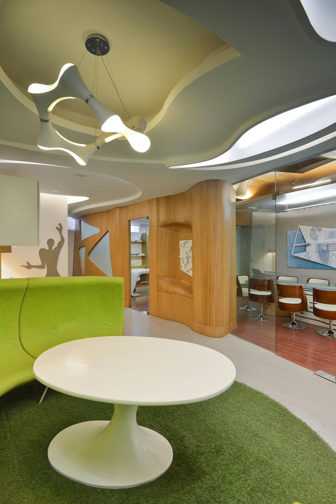 One moves down from front entrance highlighted by fixing glass roof penetrating ample light into the interior space. A raised platform has an informal conference designed by fixing multiple dia. steel pipes with an abstract panel ceiling. The flooring and walls at the front office is kept as cement finish to give emphasis on display panels. An abstract partition acts as waiting, continues on the ceiling extending into multiple abstract boxes displaying different firm’s design ideology. The lower part has open workstations connected by cantilevered wooden steps, the opening from front office looking towards the lower floor frames it. The lower part in contrast to the upper being designed in white tone. The reception table has an interesting form with backlit glass panel. A bookshelf displaying firm’s project is placed opposite to it. A green space with grass flooring and elliptical seating space is used as breakout space in the interior and used for reading books. Two workstations for senior architects are designed behind the seating.
