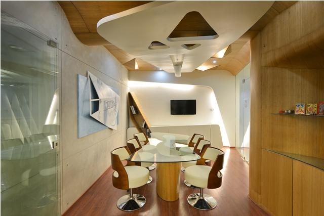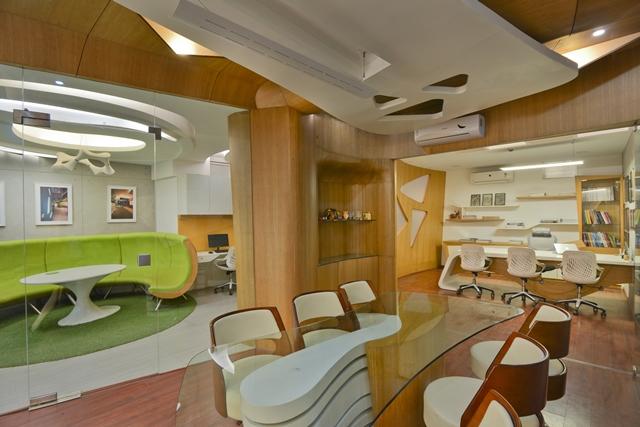 The most interesting part is an experiment with designing of the main cabin outer partition in a fluid form with veneer cladding continuing to the conference room ceiling. The partition is inclined at both the planes and takes an interesting form. The conference and cabin has a glass sliding folding partition which when pulled acts as individual space.