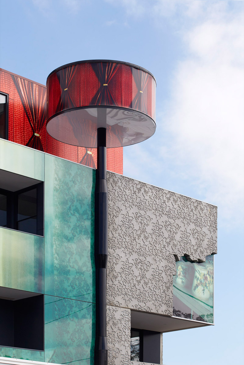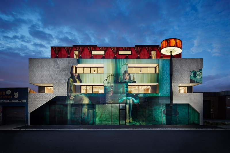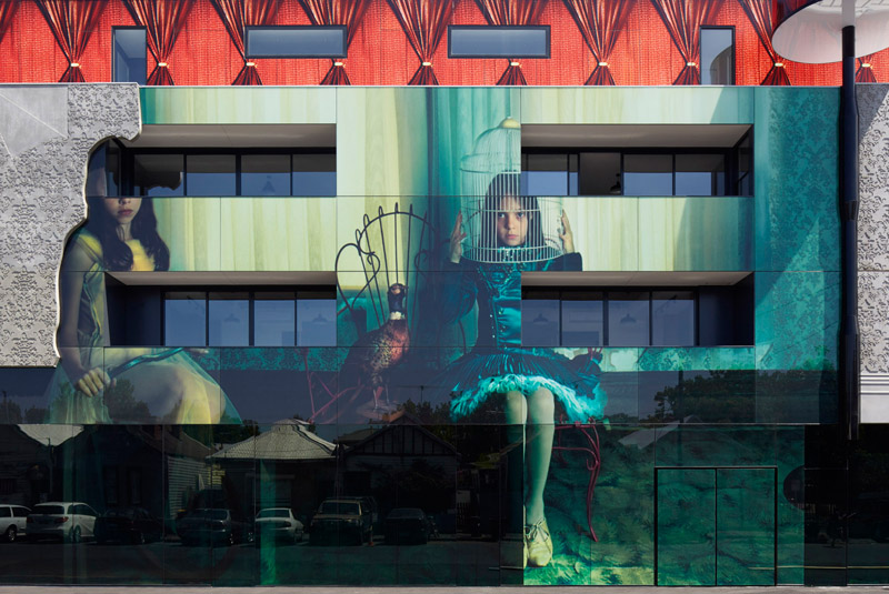 Australian artist Samantha Everton, worked with the architecture practice Kavellaris Urban Design, to create the façade of this new building in Melbourne, Australia. The mixed-use building is called “2 Girls,” and features Everton’s “Masquerade” photo art from her “Vintage Dolls” series, re-created as the building’s façade.