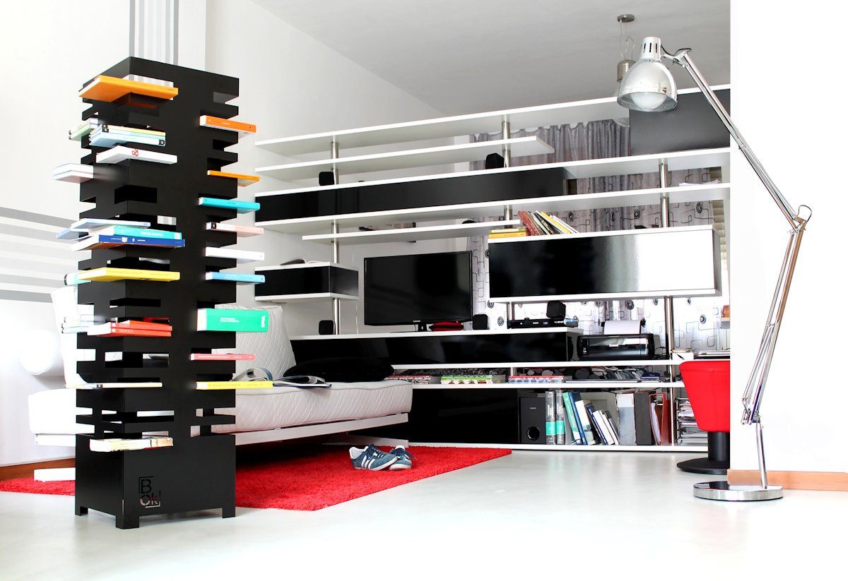 All contrasts are simplified in a metallic parallelepiped, where is possible to insert books with ordered eccentricity and it can be also adapt to space’s needs.