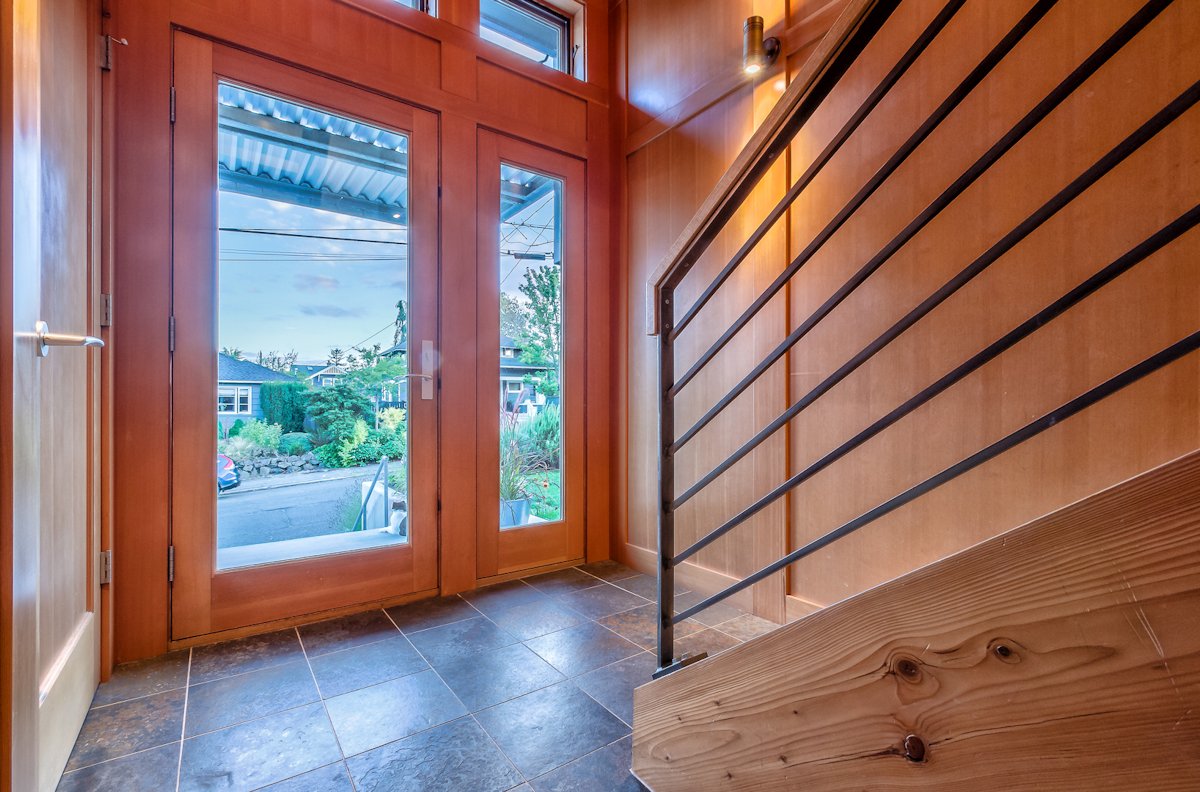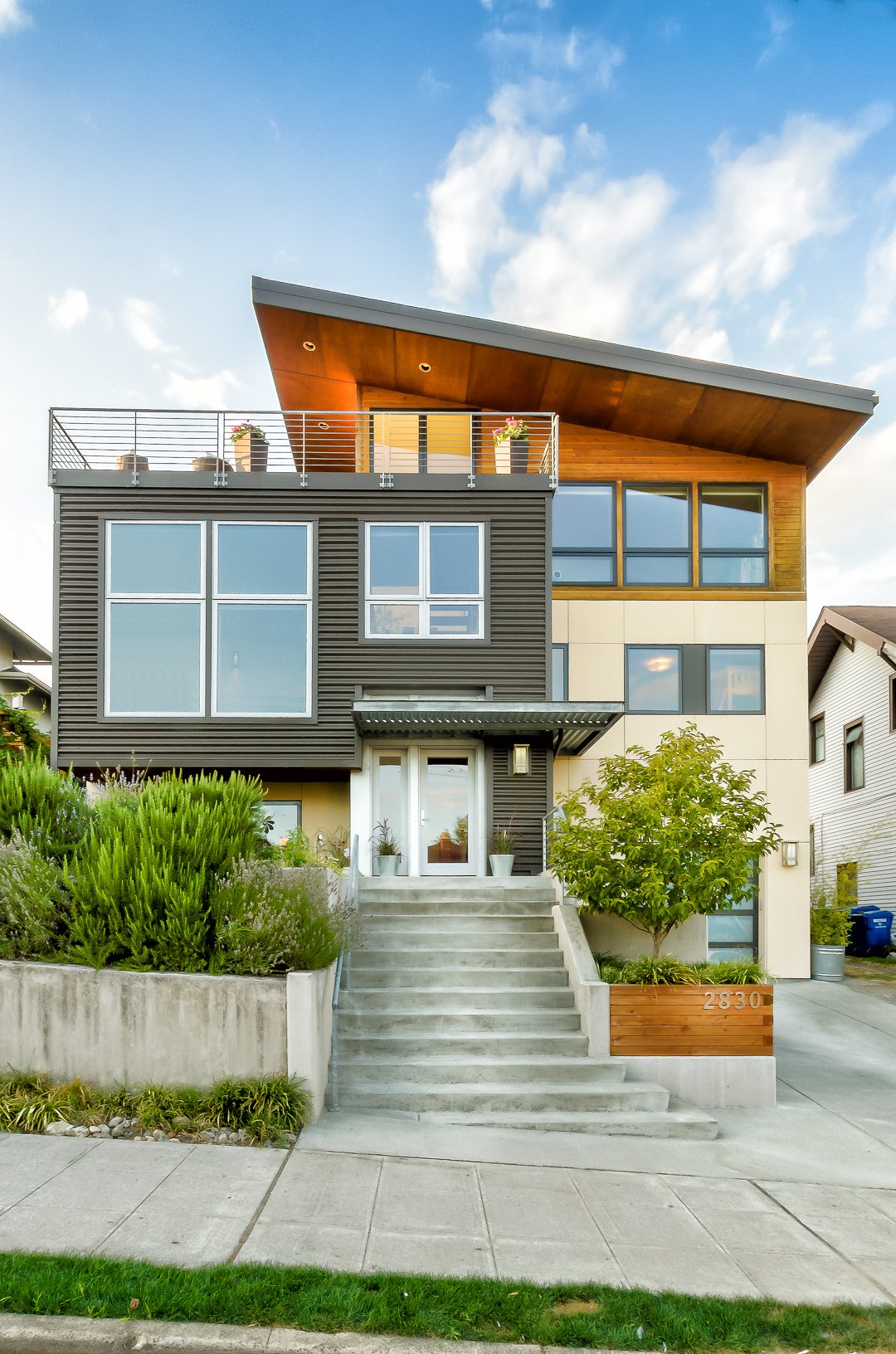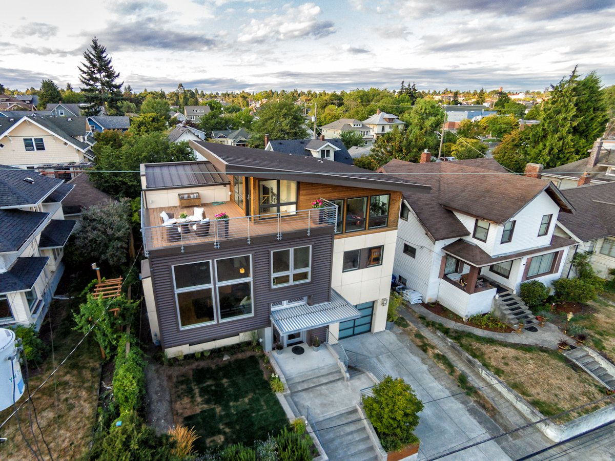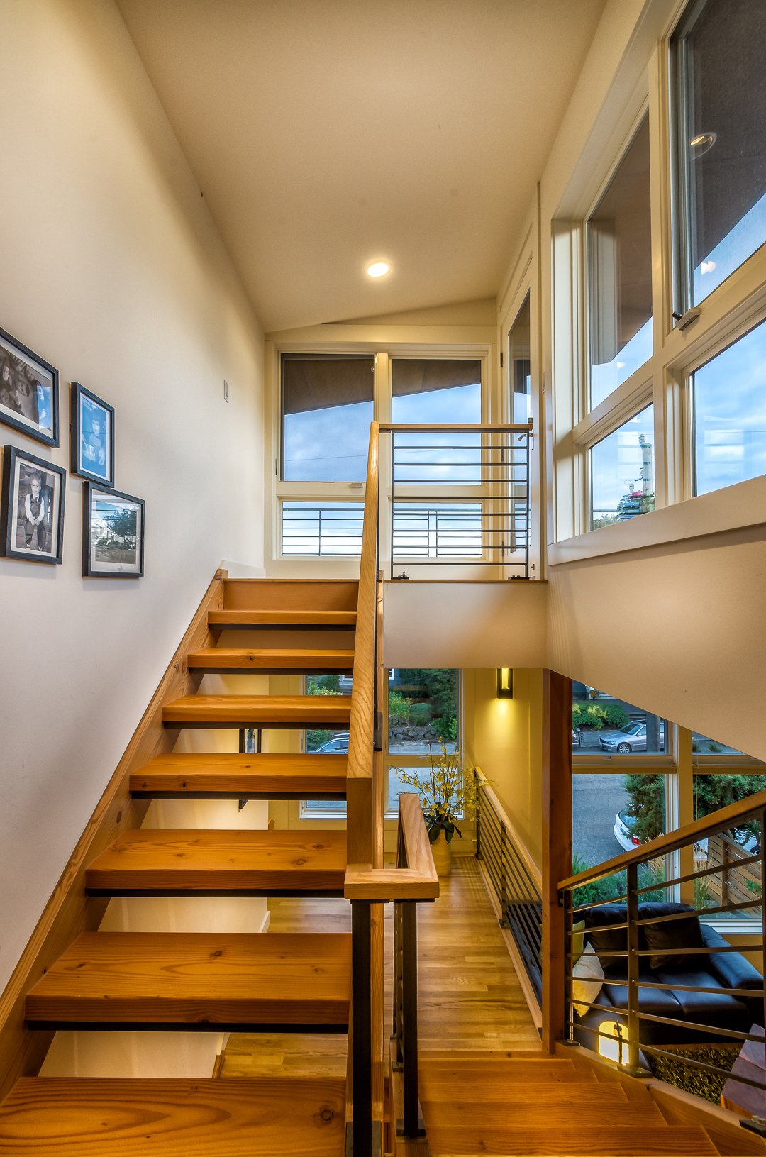 This home remodel is located just north of the Ballard Locks in Seattle, Washington. The original split-level home configuration was maintained to limit scope of work while rebuilding the central exposed stairway to the new upper floor with access to a roof top deck with views of downtown Seattle and Mount Rainier.