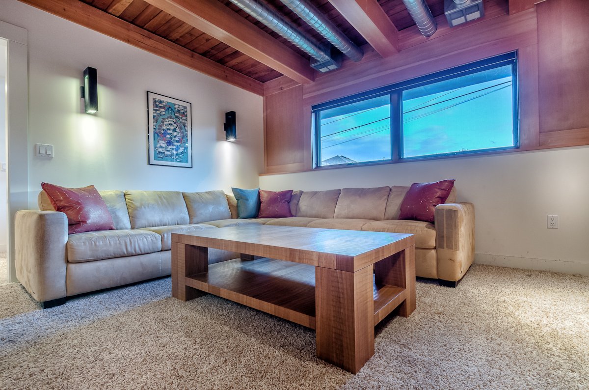 All opportunities to expose structure as well as interstitial spaces were taken on the interior, from uncovering the existing wood decking and floor beams of the main floor to the open wood stair with steel railings. The large cantilevered shed roof provides maximum summer sun shading for interior spaces, preserves the longevity of the exterior siding materials below, and offers partial shelter during the inclement weather months for continued roof deck use.