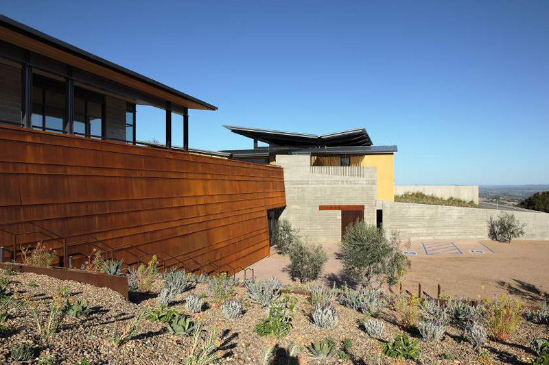 Sustainable design elements include rainwater harvesting, natural daylighting, roof photovoltaic panel set-up, green roof, xeriscape landscaping, night-cooling of fermentation and barrel storage, and minimized non-permeable paving.