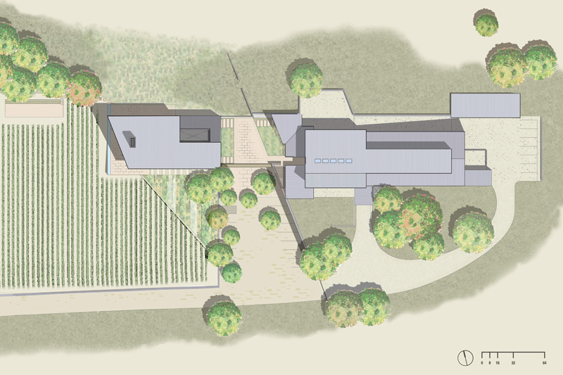 The building responds directly to the natural materials of the site, the hillside topography and climatic influences of sun and wind. The resulting design is contextually modern and expressive of the various uses contained within the winery.