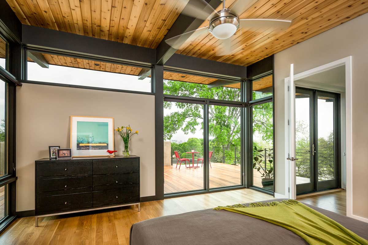 Built-in rooftop planters screen undesirable neighboring views while offering privacy to the master suite. An exterior stair connects the roof deck with the private rear yard, where a generous covered porch shades the west-facing window wall and serves as an outdoor living room.