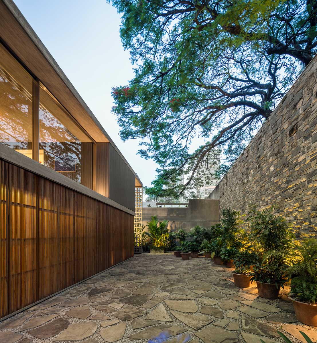 The reference to modernism lies also in the wall of hollowed-out elements, renowned from the 30’s in Brazil, as a solution to be reproduced on large scale, very appropriate for the tropical climate since it allows for shading without blocking of the fresh breeze.