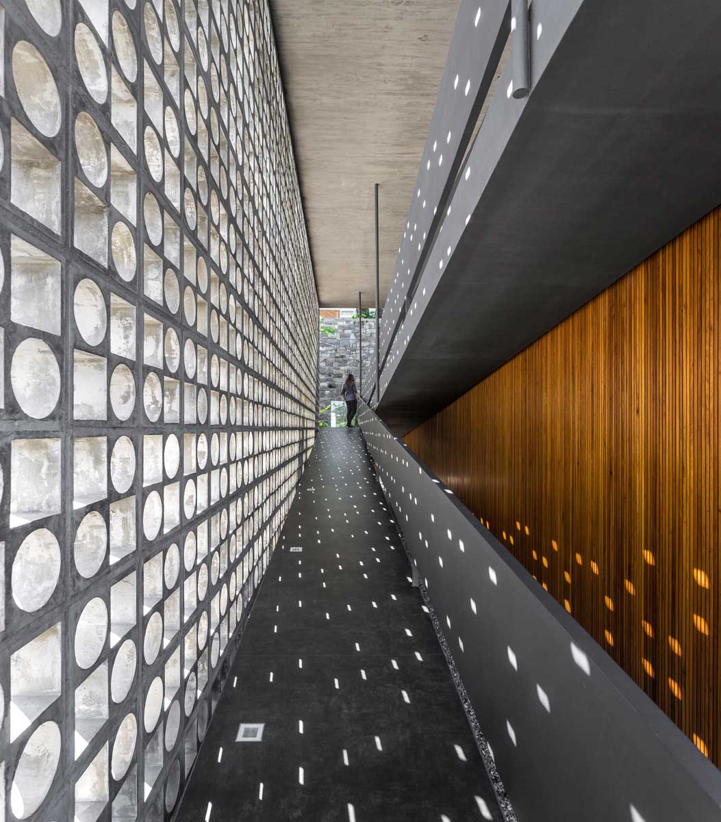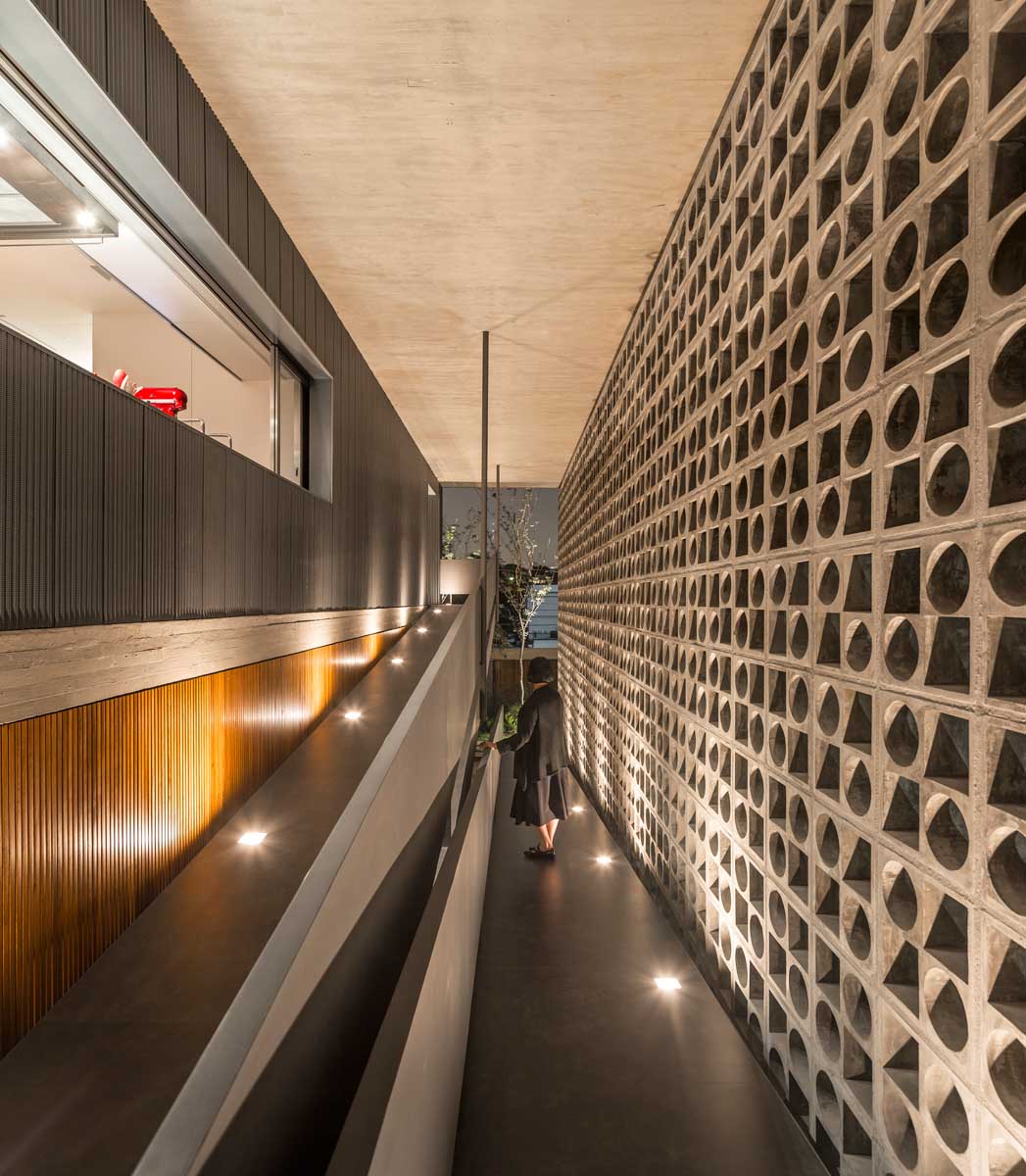 The arrival at House B+B – the access to the social area – is through an architectural trajectory, via an open ramp, located on the eastern side of the construction. This space is protected by hollowed-out concrete elements to the side, which create surprising effects of light and end up functioning as protection from bad weather conditions.