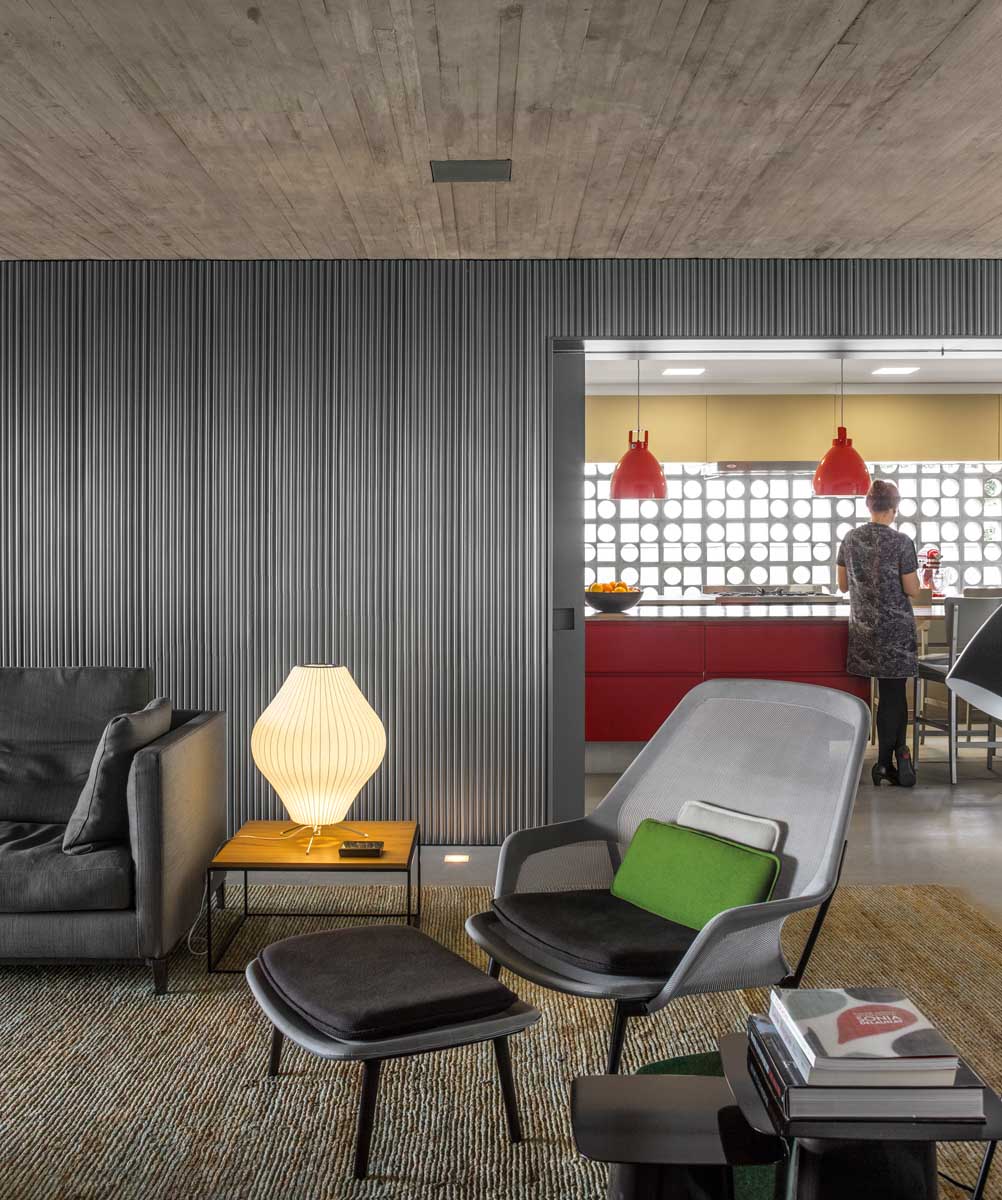 The social area of the house creates a sensation of coziness and comfort, in an open space, without any structural interference for the organization of the furniture layout. A 3.5m sliding door allows the kitchen to be completely integrated to the dining room. The counter used for food preparation is behind the window overlooking the ramp and receiving the ‘constructed’ light, filtered by the hollowed-out elements. Thus, the kitchen becomes a lit-up space and a pleasant ambient.