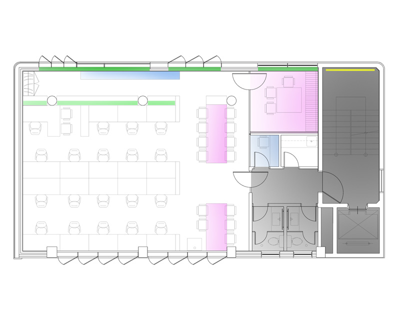 Computational fluid dynamic simulations were used to orient the window opening directions in a way that creates a subtle yet dynamic circular flow of fresh air through the offices. The architect and client worked together to do comparative air quality studies as well as statistical analysis of employee absenteeism in the previous and new offices.