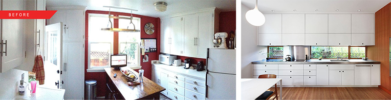Windows were added along the counter to naturally illuminate work surfaces during the day and the large window facing the backyard provides a view of the impressive cedar tree.