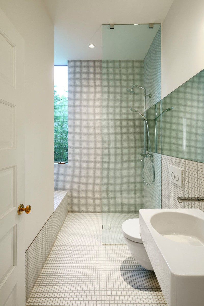 The recessed shower bench with vertical window and continuous mirror add depth and light to the compact space without sacrificing privacy. The backyard was host to a protected outdoor space, but access was inconvenient and it lacked the sort of visual connection it deserved.