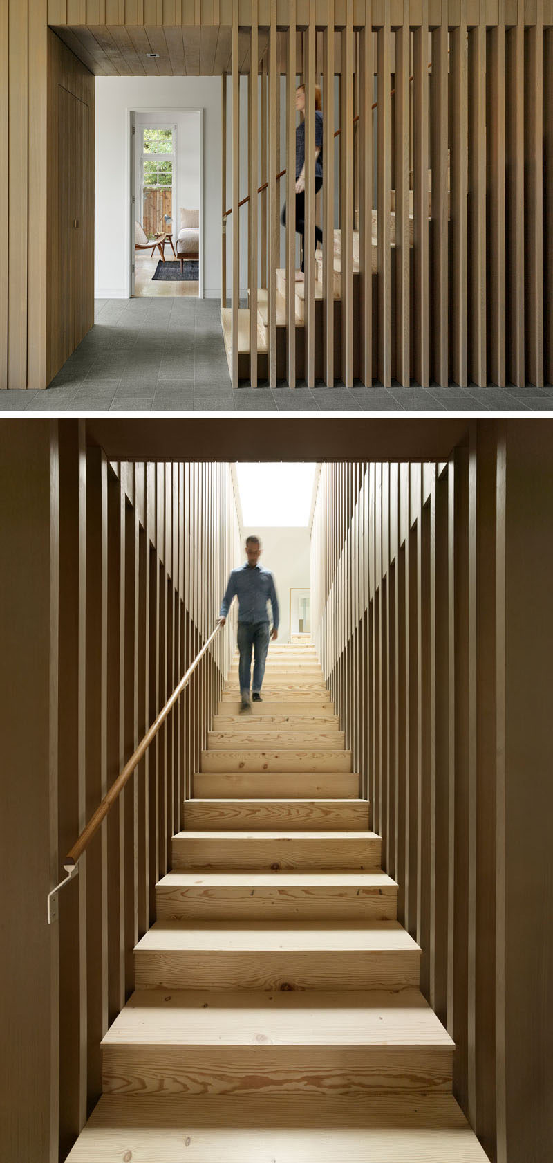 Here’s a look at the updated stairs, that are now surrounded by wood slats that don’t block the light. There’s also a skylight to keep the stairwell bright.
