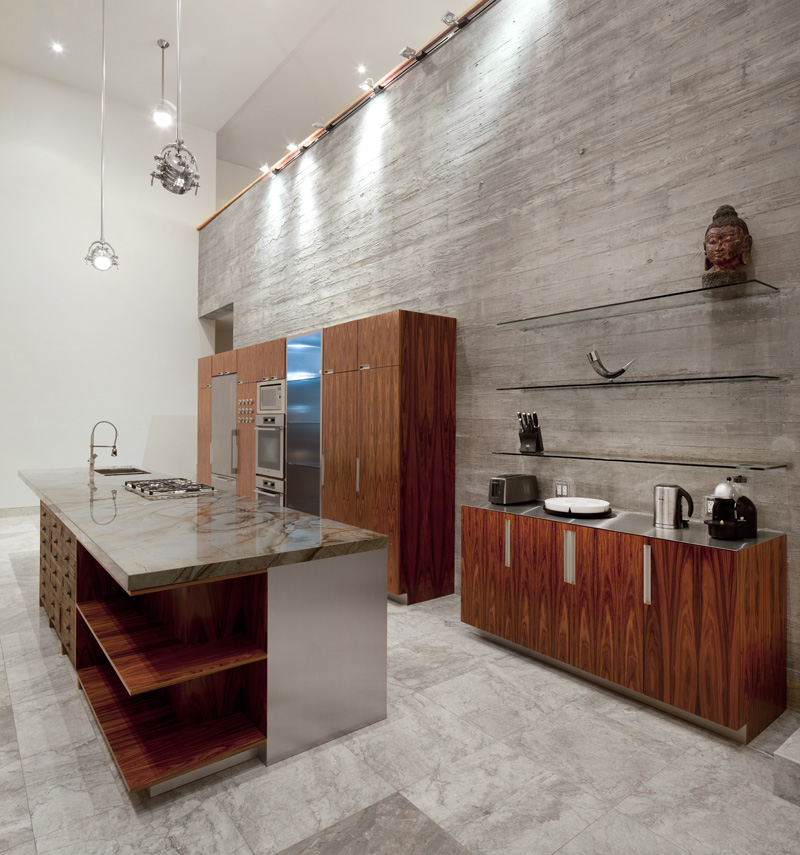 This drama is counterbalanced by the old-world beauty of an original, hand-carved wood door, reclaimed and imported from India.
