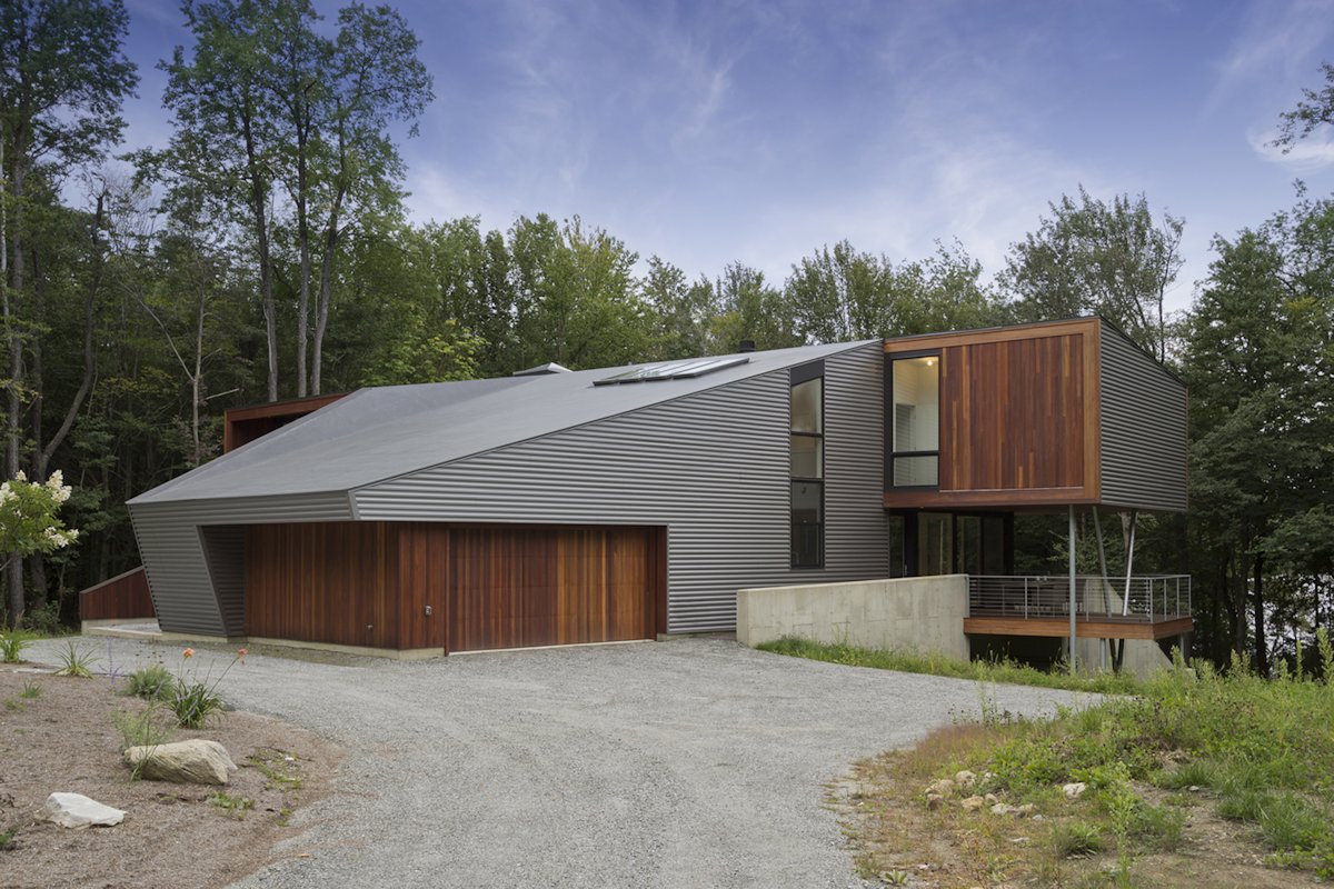 This project is a response to a client’s desire to build a family weekend house on a densely wooded sloping site with stunning views overlooking a beautiful pond and the Berkshire Hills beyond. The house is approximately 5,000 sq. ft. and conceived as a folded volumetric “sheet” enclosure that wraps and folds into itself to form and define the major interior spaces, and tie the house with the landscape.