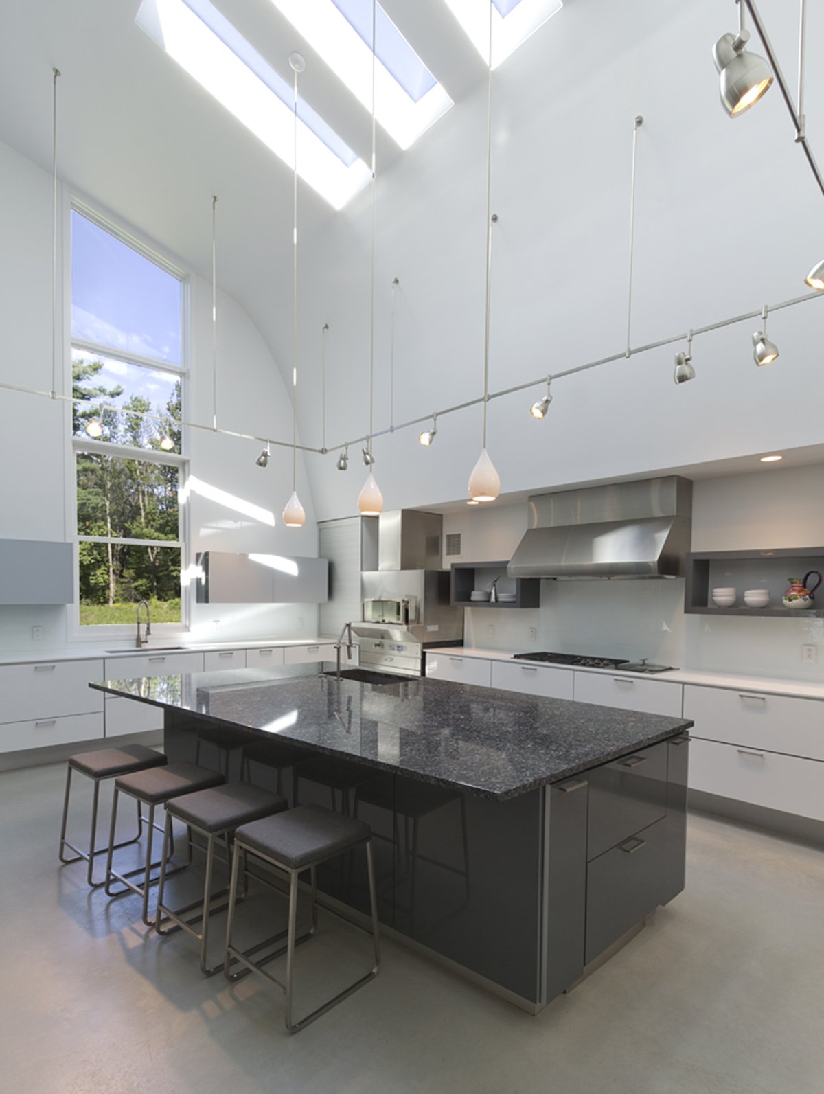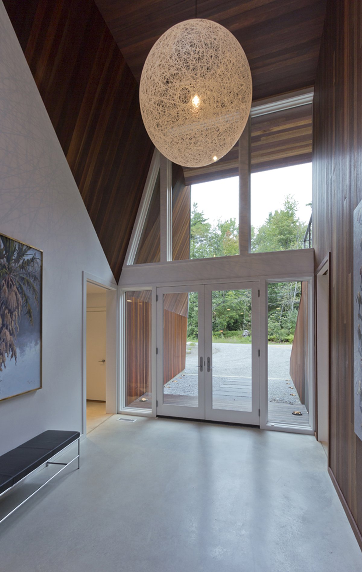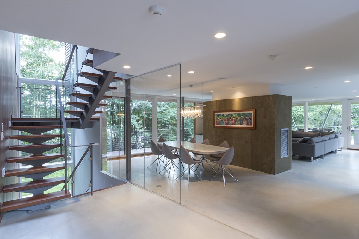 The entry approach is through a gravel courtyard with stone steps leading to glass entry doors. The exterior wood siding continues inside the entry vestibule to blur the distinction between the interior and exterior. The primary interior space is used for living, dining and a two-story tall kitchen, which acts as the metaphorical heart of the house. A screen porch extends off the dining area to look out over the pond and surrounding woods.