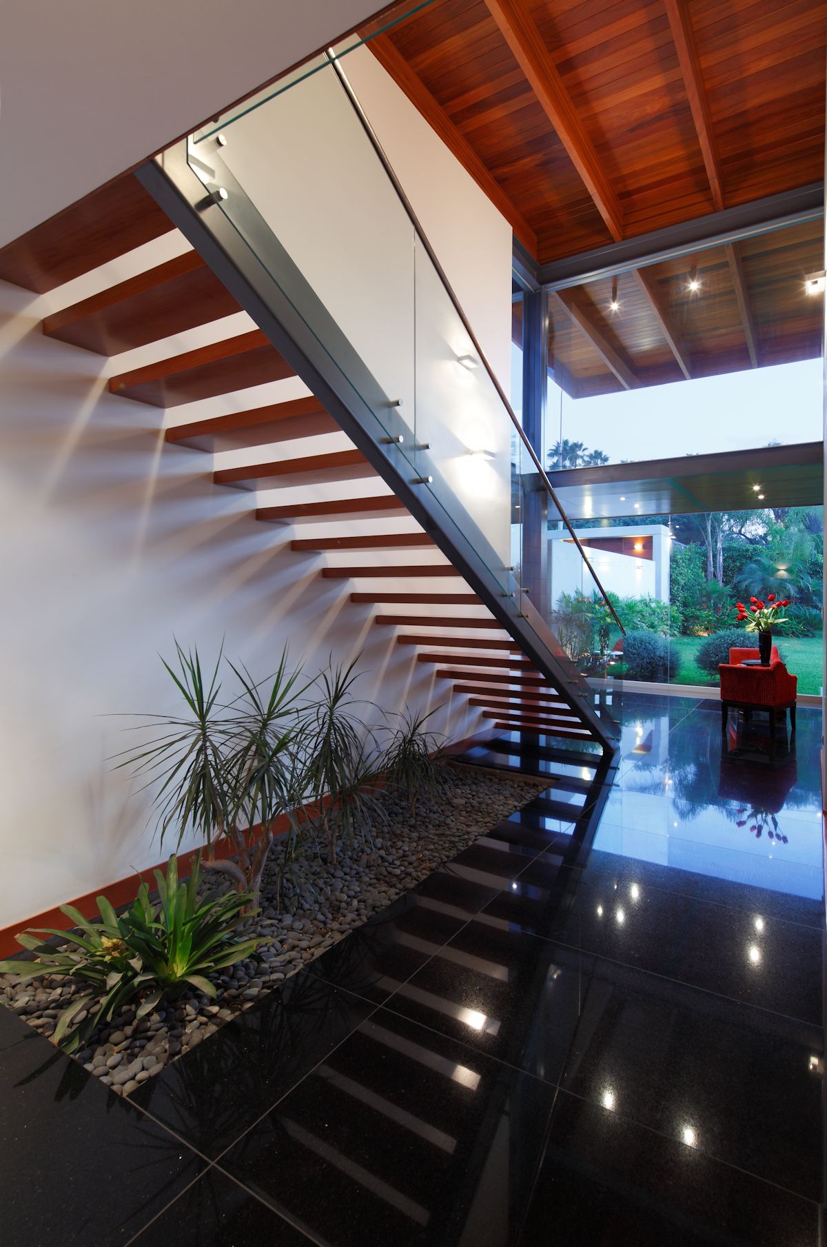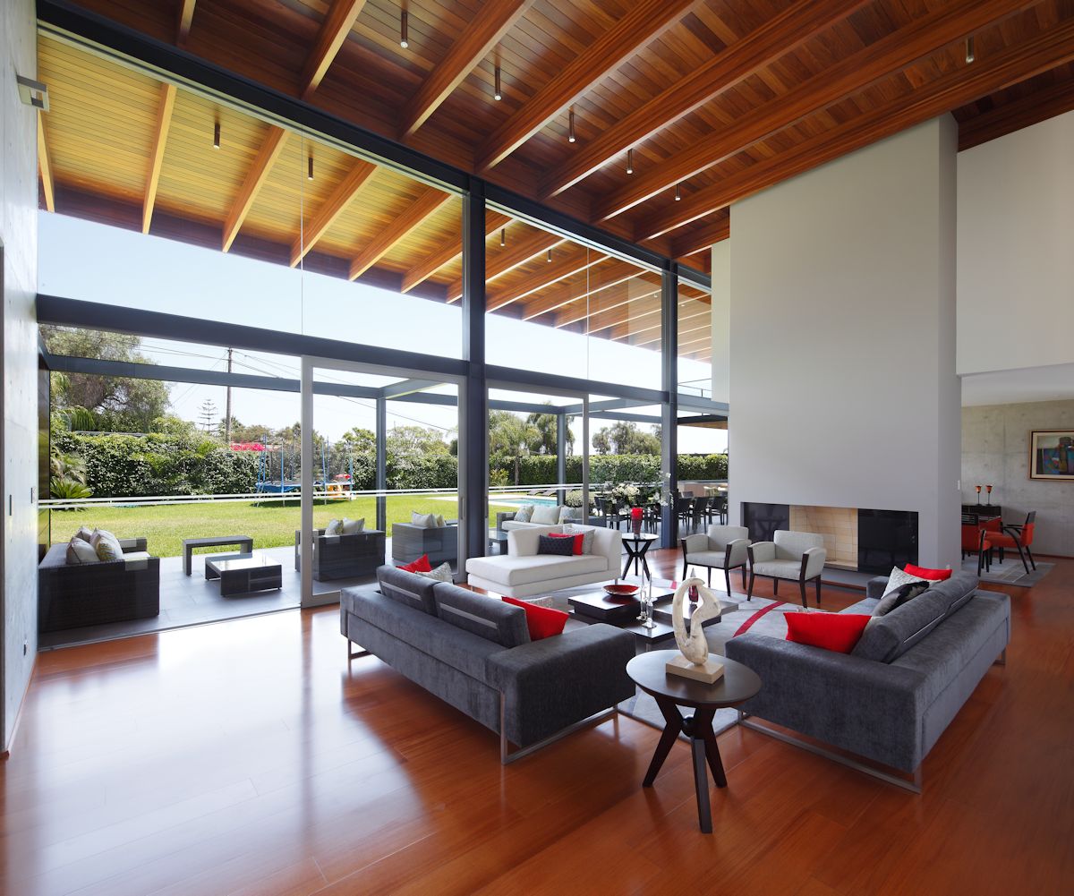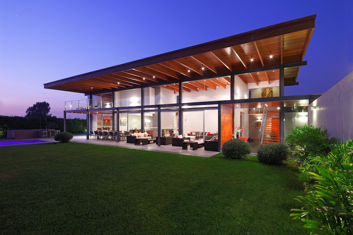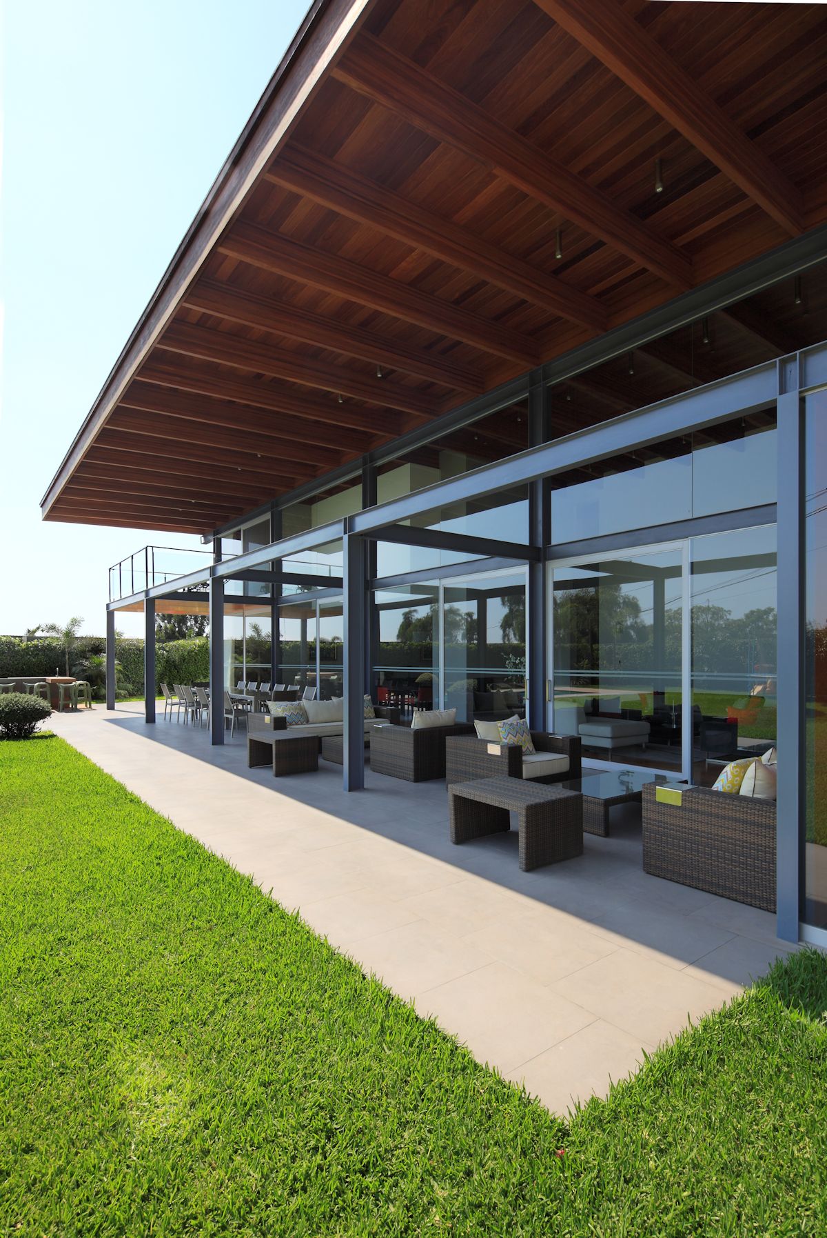 The house has been designed with a roof of structural laminated wood supported by steel and exposed concrete structures. This roof is the element that integrates the whole design and composition of the house. The steel structure that supports it also defines and moderates the scale of the different spaces of the house.