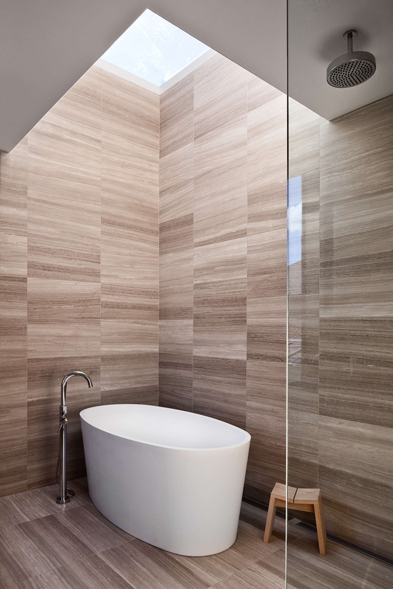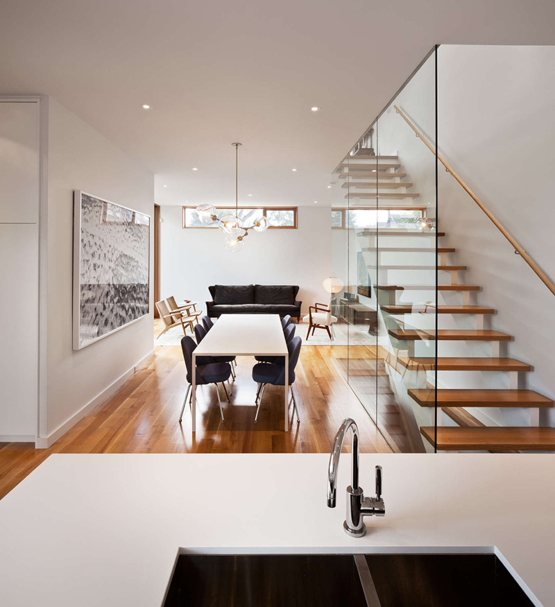 This is a contrast to the bright white interior, which is designed to capture as much daylight as possible, given the building code restrictions on windows in walls along lot lines.