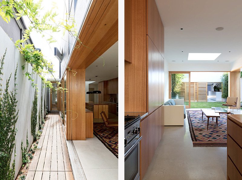 Skylight penetrations bring light into the centre of the plan, help define spaces within it and protect the privacy of neighbouring dwellings from upper level rooms while large glazed doors open new ground level interiors to unobtrusive garden courtyards.