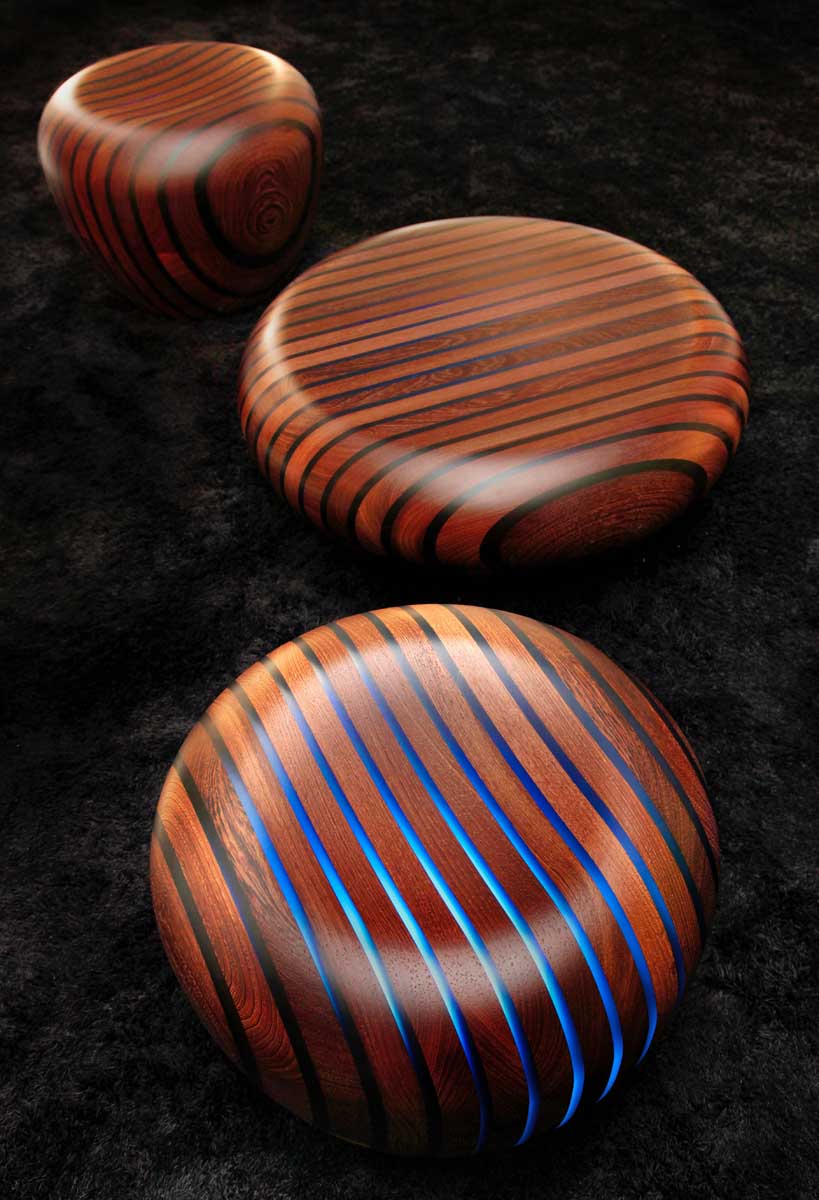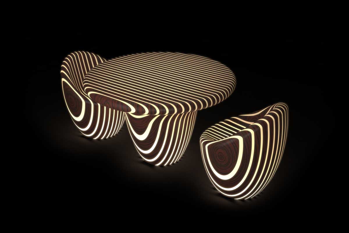 Like an enchanted forest of trees that light up at night, this fashinating ethnic collection of tables, seats and lamps, designed by Giancarlo Zema for Luxyde, uses natural materials like wood scratched by several resin rings that lighten at sunset.